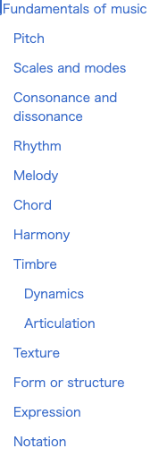 出典 Avison, Charles (1752). An Essay on Musical Expression. London: C. Davis. Bandur, Markus. 2001. Aesthetics of Total Serialism: Contemporary Research from Music to Architecture. Basel, Boston and Berlin: Birkhäuser. バローニ、マリオ(1983年)。「音楽文法の概念」、サイモン・マグワイアとウィリアム・ドラブキン訳。音楽分析2、第2号:175-208。 バートレット、クリストファー、スティーブン・G・レイツ(2010年)。『Graduate Review of Tonal Theory』。ニューヨーク:オックスフォード大学出版局。ISBN 978-0-19-537698-2。 ベント、イアン(1987年)。『Analysis』。『The New Grove Handbooks in Music』。ISBN 0-333-41732-1。 ベンワード、ブルース、およびマリリン・ナディーン・セイカー(2003年)。音楽:理論と実践、第7版、2巻。ボストン:McGraw-Hill ISBN 978-0-07-294262-0。 バーナード、ジョナサン(1981年)。「エドガー・ヴァレーズの音楽における音高/音域」。音楽理論スペクトラム3:1-25。 ボエティウス、アニキウス・マンリウス・セヴェリヌス(1989年)。クロード・V・パリスカ編。音楽の基礎(PDF)(『音楽の基礎』の翻訳)。訳:カ ルヴィン・M・バウワー。ニューヘイブン、ロンドン:イェール大学出版。ISBN 978-0-300-03943-6 – classicalliberalarts.comより。 ブラント、アンソニー(2007年)。「音楽形式」。Connexions(2011年9月11日アクセス)。[信頼性の低い情報源? カスタン、ゲルド(2009年)。「音楽記号のコード」。Music-Notation.info(2010年5月1日アクセス)。 クリスティアーニ、アドルフ・フリードリヒ(1885年)。ピアノ演奏における表現の原則。ニューヨーク:Harper & Brothers。 ダールハウス、カール(2009年)。「ハーモニー」。グローヴ音楽オンライン、ディーン・ルート編集(2015年7月30日アクセス、2015年12月 11日確認)。 ダーウィン、チャールズ(1913年)。『人間と動物における感情表現』。ニューヨーク:D.アプルトン・アンド・カンパニー。 デイヴィス、スティーヴン(1994年)。『音楽の意味と表現』。イサカ:コーネル大学出版。ISBN 978-0-8014-8151-2。 d'Erlanger, Rodolphe (ed. and trans.) (1930–56). La Musique arabe, six volumes. Paris: P. Geuthner. Dunsby, Jonathan; Stopford, John (1981). 「The Case for a Schenkerian Semiotic」. Music Theory Spectrum. 3: 49–53. doi:10.2307/746133. JSTOR 746133. Ekwueme, Laz E. N. (1974). 「Concepts of African Musical Theory」. Journal of Black Studies 5, no. 1 (September): 35–64 Forsyth, Cecil (1935). Orchestration, second edition. New York: Dover Publications. ISBN 0-486-24383-4. ガーランド、トルディ・ハメル、およびチャリティ・ヴォーン・カーン(1995年)。数学と音楽:調和のとれたつながり。パロアルト:デール・シーモア出 版。ISBN 978-0-86651-829-1。 ゲルストナー、カール。1964年。『プログラム設計:4つのエッセイと序文、ポール・グレディンガーによる序文の序文』。D.Q.ステファンソンによる 英訳。スイス、テューフェン:アーサー・ニグリ。1968年、増補新版。 Ghrab, Anas (2009). 「Commentary anonyme du Kitāb al-Adwār. Édition critique, traduction et présentation des lectures arabes de l'œuvre de Ṣafī al-Dīn al-Urmawī」. PhD thesis. Paris: University Paris-Sorbonne. グラント、M[orag] J[osephine] (2001年). 『連続音楽、連続美学:戦後ヨーロッパの作曲理論』。『20世紀の音楽』、アーノルド・ウィットール、総編集。ケンブリッジおよびニューヨーク:ケンブ リッジ大学出版局。ISBN 0-521-80458-2。 グリーン、ダグラス M. (1979年). 調性音楽における形式. フォートワース: Harcourt Brace Jovanovich College Publishers; ニューヨークおよびロンドン: Holt, Rinehart and Winston. ISBN 0-03-020286-8. ハートマン、ウィリアム・M. (2005年). 『シグナル、サウンド、そして感覚』、修正第5刷。『現代音響学と信号処理』。ニューヨーク州ウッドベリー:アメリカ物理学会;ニューヨーク:スプリン ガー。ISBN 1563962837。 ジャミニ、デボラ(2005年)。『ハーモニーと作曲:基礎から中級編まで、DVDビデオ付き』。ビクトリア、BC:Trafford。978-1- 4120-3333-6。 カロイ、オットー(1965年)。『音楽入門』。[完全引用が必要]: ペンギンブックス。 キルマー、アン・D. (1971年). 「古代メソポタミアの音楽理論の発見」。『アメリカ哲学協会議事録』115巻2号:131–149。 キルマー、アン、サム・ミレルマン。日付不明。「メソポタミア。8.理論と実践」。『グローヴ音楽オンライン』。『オックスフォード音楽オンライン』。 2015年11月13日アクセス。(購読契約が必要) Kivy, Peter (1993). The Fine Art of Repetition: Essays in the Philosophy of Music. Cambridge and New York: Cambridge University Press.ISBN 978-0-521-43462-1, 978-0-521-43598-7 (cloth & pbk). Kliewer, Vernon (1975). 「Melody: Linear Aspects of Twentieth-Century Music」. In Aspects of Twentieth-Century Music, edited by Gary Wittlich, 270–321. Englewood Cliffs, New Jersey: Prentice-Hall. ISBN 0-13-049346-5. クレイマー、ジョナサン・D. (1988年). 『音楽の時代:新たな意味、新たな時間性、新たなリスニング戦略』. ニューヨーク:シャーマー・ブックス. クビク、ゲルハルト (2010年). 『アフリカ音楽理論』全2巻. シカゴ:シカゴ大学出版. ISBN 0-226-45691-9. クンメル、H. M. [de] (1970). 「バビロニアのハープの調弦について」. 『オリエンタリア』39:252–263. ラム、ジョセフ・S・C. 「中国、