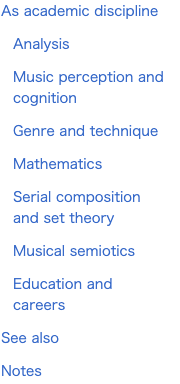 | As academic discipline The scholarly study of music theory in the twentieth century has a number of different subfields, each of which takes a different perspective on what are the primary phenomenon of interest and the most useful methods for investigation. Analysis Main articles: Musical analysis, Schenkerian analysis, and Transformational theory ![]() Typically a given work is analyzed by more than one person and different or divergent analyses are created. For instance, the first two bars of the prelude to Claude Debussy's Pelléas et Melisande are analyzed differently by Leibowitz, Laloy, van Appledorn, and Christ. Leibowitz analyses this succession harmonically as D minor:I–VII–V, ignoring melodic motion, Laloy analyses the succession as D:I–V, seeing the G in the second measure as an ornament, and both van Appledorn and Christ analyse the succession as D:I–VII. Playⓘ Musical analysis is the attempt to answer the question how does this music work? The method employed to answer this question, and indeed exactly what is meant by the question, differs from analyst to analyst, and according to the purpose of the analysis. According to Ian Bent, "analysis, as a pursuit in its own right, came to be established only in the late 19th century; its emergence as an approach and method can be traced back to the 1750s. However, it existed as a scholarly tool, albeit an auxiliary one, from the Middle Ages onwards."[70][incomplete short citation] Adolf Bernhard Marx was influential in formalising concepts about composition and music understanding towards the second half of the 19th century. The principle of analysis has been variously criticized, especially by composers, such as Edgard Varèse's claim that, "to explain by means of [analysis] is to decompose, to mutilate the spirit of a work".[71] Schenkerian analysis is a method of musical analysis of tonal music based on the theories of Heinrich Schenker (1868–1935). The goal of a Schenkerian analysis is to interpret the underlying structure of a tonal work and to help reading the score according to that structure. The theory's basic tenets can be viewed as a way of defining tonality in music. A Schenkerian analysis of a passage of music shows hierarchical relationships among its pitches, and draws conclusions about the structure of the passage from this hierarchy. The analysis makes use of a specialized symbolic form of musical notation that Schenker devised to demonstrate various techniques of elaboration. The most fundamental concept of Schenker's theory of tonality may be that of tonal space.[72] The intervals between the notes of the tonic triad form a tonal space that is filled with passing and neighbour notes, producing new triads and new tonal spaces, open for further elaborations until the surface of the work (the score) is reached. Although Schenker himself usually presents his analyses in the generative direction, starting from the fundamental structure (Ursatz) to reach the score, the practice of Schenkerian analysis more often is reductive, starting from the score and showing how it can be reduced to its fundamental structure. The graph of the Ursatz is arrhythmic, as is a strict-counterpoint cantus firmus exercise.[73] Even at intermediate levels of the reduction, rhythmic notation (open and closed noteheads, beams and flags) shows not rhythm but the hierarchical relationships between the pitch-events. Schenkerian analysis is subjective. There is no mechanical procedure involved and the analysis reflects the musical intuitions of the analyst.[74] The analysis represents a way of hearing (and reading) a piece of music. Transformational theory is a branch of music theory developed by David Lewin in the 1980s, and formally introduced in his 1987 work, Generalized Musical Intervals and Transformations. The theory, which models musical transformations as elements of a mathematical group, can be used to analyze both tonal and atonal music. The goal of transformational theory is to change the focus from musical objects—such as the "C major chord" or "G major chord"—to relations between objects. Thus, instead of saying that a C major chord is followed by G major, a transformational theorist might say that the first chord has been "transformed" into the second by the "Dominant operation." (Symbolically, one might write "Dominant(C major) = G major.") While traditional musical set theory focuses on the makeup of musical objects, transformational theory focuses on the intervals or types of musical motion that can occur. According to Lewin's description of this change in emphasis, "[The transformational] attitude does not ask for some observed measure of extension between reified 'points'; rather it asks: 'If I am at s and wish to get to t, what characteristic gesture should I perform in order to arrive there?'"[75] Music perception and cognition Further information: Music psychology, Fred Lerdahl, and Ray Jackendoff Music psychology or the psychology of music may be regarded as a branch of both psychology and musicology. It aims to explain and understand musical behavior and experience, including the processes through which music is perceived, created, responded to, and incorporated into everyday life.[76][77] Modern music psychology is primarily empirical; its knowledge tends to advance on the basis of interpretations of data collected by systematic observation of and interaction with human participants. Music psychology is a field of research with practical relevance for many areas, including music performance, composition, education, criticism, and therapy, as well as investigations of human aptitude, skill, intelligence, creativity, and social behavior. Music psychology can shed light on non-psychological aspects of musicology and musical practice. For example, it contributes to music theory through investigations of the perception and computational modelling of musical structures such as melody, harmony, tonality, rhyth