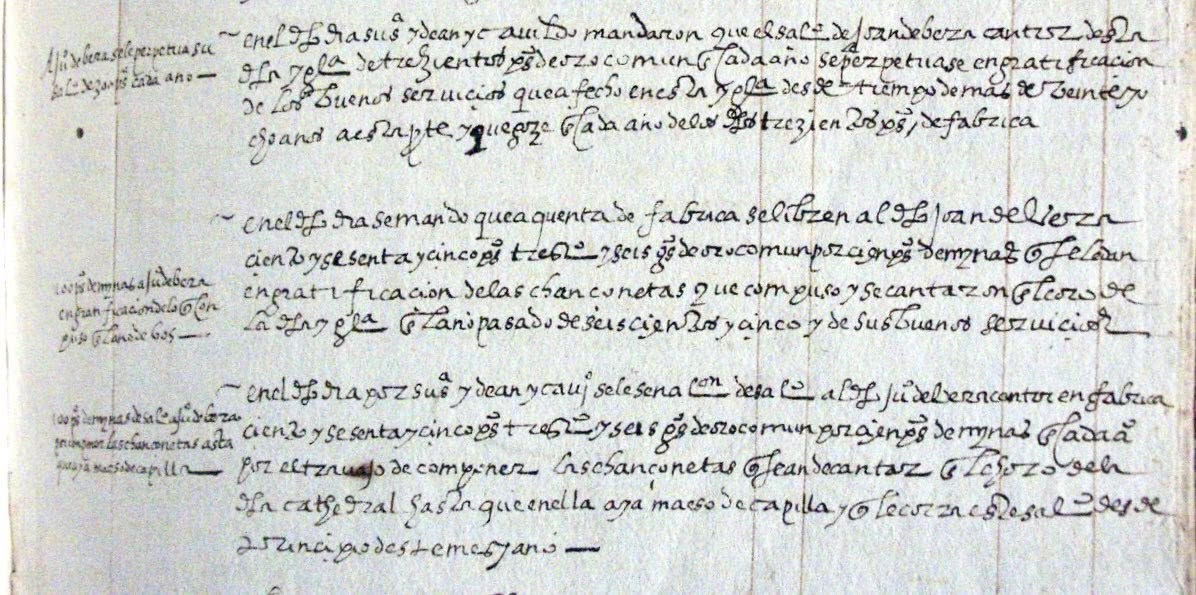 プエブラ大聖堂評議会の決議、1606年1月3日火曜日。 • 決定事項:「フアン・デ・ベラへの年俸300ペソは永久に継続される」。 決議:「その日、閣下およびディーン、評議会は、この教会の聖歌隊長であるフアン・デ・ベラの年俸300ペソ(普通金)を、28年以上にわたりこの教会で 果たしてきた功績に対する報奨として、永続的に維持することを命じた。そして、彼は毎年、その300ペソを享受する権利を有する」。 • 特許状:「605年に作曲した功績に対する謝礼として、フアン・デ・ベラに100ペソの鉱山金を授ける」。 決議:「当該日に、工場経費として、フアン・デ・ベラに165ペソ、3トミン、6粒の普通金(100ペソ相当)を支給することを命じた。これは、彼が作曲 し、605年に当該教会の聖歌隊で歌われたシャンソネット、および彼の功績に対する謝礼として支給されるものである」。 • 特許状:「100ペソの鉱山ペソを、礼拝堂の師が就任するまでの間、シャンゾネを創作した功績に対して、フアン・デ・ベラに給与として支給する」。 合意: 「その日、司教、ディーン、およびカビルドは、歌手であるフアン・デ・ベラに対し、その大聖堂の聖歌隊で歌われるシャンソネットを作曲する仕事に対して、 礼拝堂の音楽監督が就任するまでの間、毎年100ペソ・デ・ミナに相当する165ペソ、3トミン、6粒の普通金貨を給与として支給することを決定した。こ の給与は、今月および今年の初めから支払われるものとする」。 • 作曲家の給与はわずか8か月間しか続かなかった。1606年9月19日、ガスパール・フェルナンデスが礼拝堂の師として迎えられたからである。 ![]() https://x.gd/Bb6eU |