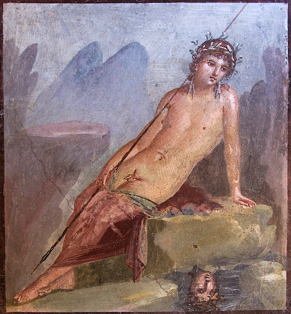 を拒んだ罰として、泉に映った自分の姿に恋するという呪いを受けた。彼はどうしても想いを遂げることができないので、やつれ果て水面に写った自分に接吻を