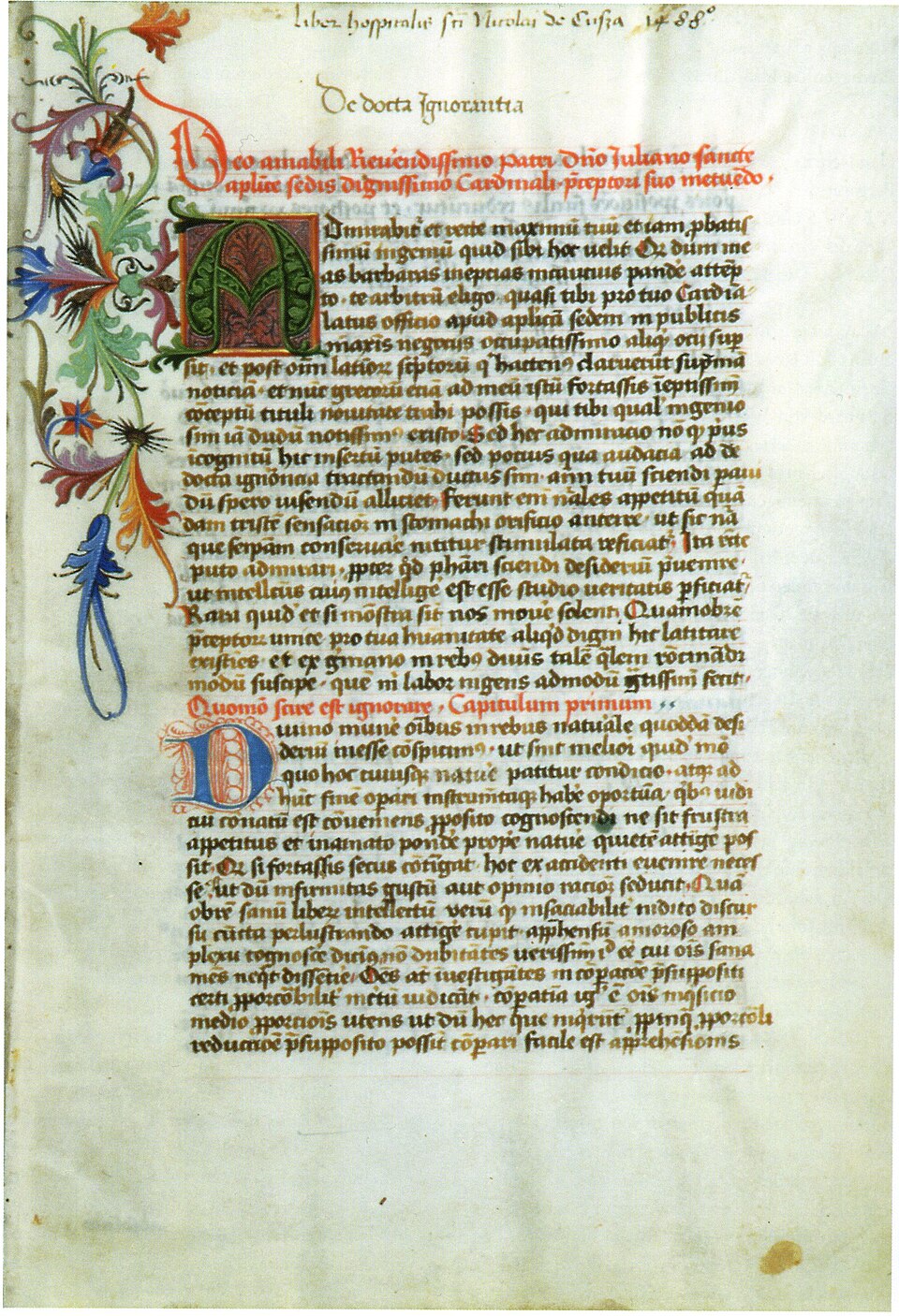 人文科学および科学活動 1425年の春、ニコラウスはケルン大学に教会法の博士として入学した。おそらくそこで教鞭をとったと思われるが、その証拠はない。彼は、6歳年上のヘイ メリクス・デ・カンポ教授と親交を深めた。ヘイメリクスは、ケルン大学で最初は芸術学部で教鞭をとっていたが、1428年から神学を教えた。スコラ哲学の 哲学者であり神学者でもあるアルベルトゥス・マグヌスの伝統を受け継いだヘイメリクスは、ニコラウスに大きな影響を与えた。彼はニコラウスに新プラトン主 義を教え、中世に古代新プラトン思想を伝えた偽ディオニュシオス・アレオパギタの著作を紹介した。[6] 1428年、ニコラウスはカタルーニャの思想家ライムンドゥス・ルルスの著作を研究するためにパリへ旅した。彼はルルスについて深く研究し、カタルーニャ 人の著作の多くを自ら書き写し、その際にメモを取った。[7] 1428年と1435年、ルーヴェン大学から教会法教授の職をオファーされたが、彼はそれを断った。 人文主義者として、ニコラウスは歴史・文献学の研究において、一部は失われた古代の著作の写本を発見し、未知の中世の資料を発見し、また資料のテキストを 批判的に考察することで、重要な貢献をした。彼は、当時、教会改革をめぐる論争のために特に時事的な価値があった、法史研究の先駆者の一人だった。彼の功 績は、一般的な法典を参考にしただけでなく、失われた写本や文書を見つけ出し、当時の紛争について評価を行ったことで、先駆的なものだった。彼は、古代ゲ ルマン民族の民法を研究し、その規定をその時代の法実務と比較した。ケルン大聖堂図書館で、彼は、中世初期のフランク王たちへの教皇の手紙(「Codex epistolaris Carolinus」)が記された写本を発見した。1433年、彼は歴史的な議論を用いて、11世紀以来、教皇庁が領土の権利を主張する根拠としてきた、 コンスタンティヌス大帝の文書とされる「コンスタンティヌスの寄進」が偽物であることを証明した。その数年後、ロレンツォ・ヴァッラが言語学的観察に基づ いて、その偽造を証明した。また、ニコラウスは、偽イシドールス法典に含まれていた、古代の教皇によるとされる文書も偽物であることを証明した。彼が発見 した古代の作家たちの作品を含む写本の中には、それまで知られていなかったプラウトゥスの12の喜劇や、タキトゥスの年代記の最初の6冊が含まれていた。 人文主義者たちと同様に、ニコラウスも書物愛好家であり、あらゆる種類の貴重な写本を熱心に収集し、豪華な装飾が施された本も高く評価していた。しかし、 彼は典型的なルネサンス人文主義者ではなかった。なぜなら、主に文体の質に重きを置く文学、完璧な修辞学や詩の芸術への熱意は、彼にとってあまり重要では なかったからだ。その代わりに、彼は当時の人文主義者たちには珍しい、難しい哲学的・神学的問題について独自に考察することに関心を示していた。 1450年、ニコラウスは天文学者ゲオルク・フォン・ペウアーバッハと親交を結んだ。それ以前から、彼は天文学に深く関心を持ち、1444年には天文学の器具や文献を購入していたが、その器具を自身の観測にも使用していたかどうかは不明である。[8] ニコラウスは、暦の改革に関する著作(De correctione calendarii)の中で、ユリウス暦と復活祭の計算の誤りを指摘した。これにより、彼は暦の改革に向けた取り組みの重要な代表者となった。しかし、 彼の主張は、1582年にグレゴリオ暦の改革によって初めて実現した。 |