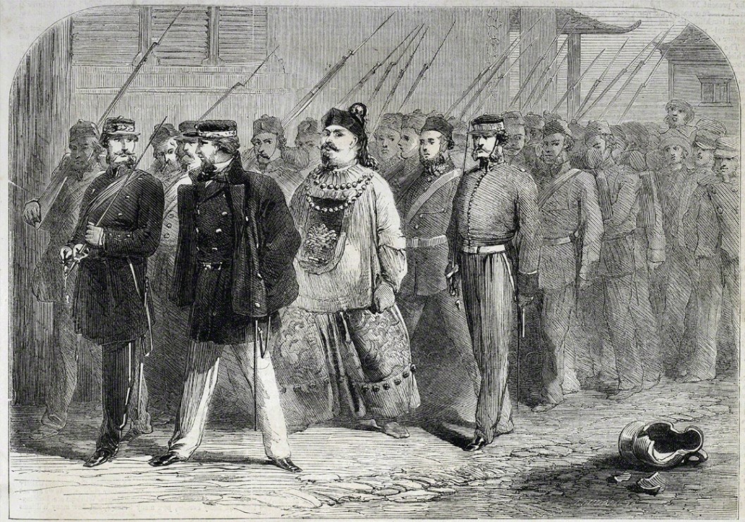 広州第二の戦い(1857年) 詳細は「広州の戦い(1857年)」を参照 ![]() 広州陥落後の葉銘臣の捕縛 1857年を通じて、イギリス軍は香港に集結し始め、フランス軍も加わった。1857年12月までに、彼らは十分な艦船と兵力を確保し、広州への入港権を 認めた条約義務の不履行を問題視するに至った。[14]: 502 [信頼性の高い出典が必要] パークスは香港総督ジョン・ボウリング卿とマイケル・シーモア提督の支持を得て、12月14日に最後通牒を突きつけた。24時間以内に捕虜が解放されなけ れば広州を砲撃すると脅したのである。[18][ページ指定が必要][23] その後、アロー号の残存乗組員は解放されたが、葉銘臣総督は謝罪せず、条約条項の履行も拒否した。シーモア、ファン・ストラウベンゼー少将、ド・ジュヌイ 提督は命令通り広州攻撃計画に合意した。[14]:503 この事件はアロー号事件として知られるようになり、その後の紛争の別名となった。[24] [ページ番号が必要] ![]() 1860年に要塞を占領するイギリス軍 イギリス軍は1857年のインド大反乱で遅延したが、1856年のアロー号事件を受けて珠江から広州を攻撃した。葉銘臣総督は要塞に駐屯する全ての中国兵 に、イギリス軍の侵入に抵抗しないよう命じた。広州近郊の要塞を容易に占領した後、イギリス軍は広州を攻撃した。[出典必要] 1858年1月1日[18][ページ必要]、人口100万人以上[25][ページ必要]の広州が6,000人未満の兵力で占領された結果、英仏軍は15名 の死者、113名の負傷者という苦悩を味わった。守備隊と住民の死傷者は200人から650人に上った[出典必要]。葉銘臣は捕らえられ、インドのカル カッタへ流刑となり、そこで餓死した[26]。 一方、香港では1月にジョン・ボウリングとその家族への毒殺未遂事件(エシン・ベーカリー事件)が発生した可能性がある。しかし、もし意図的なものだった としても、パンにヒ素を混入した罪で起訴されたパン職人は、生地に過剰な量の毒を入れたため、被害者は十分な量の毒を吐き出し、体内に残った毒は致死量に は達しなかった。呼び出し役が警報を発し、さらなる被害を防いだ。[27] 英国で知られるようになったアロー号事件(及び英軍の対応)は論争の的となった。英国下院は3月3日、政府に対する非難決議を263対249で可決し、次のように述べた: 本院は広州河において英中当局間で発生した衝突を憂慮をもって聴取した。中国政府が1842年条約不履行に関して本国に苦情の理由を与えた程度について意 見を表明せずとも、本院は提出された文書がアロー号事件における広州での暴力措置を正当化する十分な根拠を示していないと判断する。よって中国との通商関 係状況を調査する特別委員会を設置する。[28][ページ番号] これに対し、ホイッグ党の首相パーマーストン卿は決議を提出したホイッグ党議員の愛国心を攻撃し、議会は解散された。これにより1857年3月の英国総選挙が実施された。[出典が必要] 中国問題は選挙で主要な争点となり、パーマーストンは議席数を増やして勝利した。これによりホイッグ党内で中国支持派の声が封じられた。新議会はハリー・ パークスが提出したアロー号事件報告書に基づき、中国への賠償請求を決議した。フランス帝国、アメリカ合衆国、ロシア帝国に対し、英国は同盟結成を要請し た。[出典が必要] |