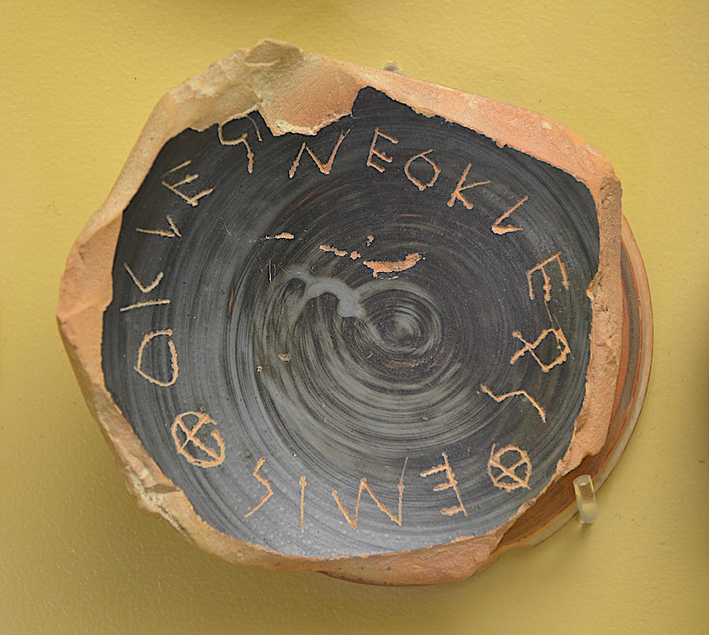歴史 追放刑はアテナイ民主政の全期間(紀元前506年~322年頃)を通じて行われたわけではなく、紀元前5世紀にのみ実施された。アリストテレスの『アテナ イの憲法』22.3[20]に見られる標準的な説によれば、この制度の創設者は民主政確立の要となった改革者クレイトスである。この説によれば、追放制度 は紀元前506年頃から存在していたことになる。しかし実際に最初の犠牲者が追放されたのは紀元前487年、つまり約20年後であった。その後60年間 で、彼に続いて12人以上の個人が追放された。このリストは完全ではない可能性がある[21]。既知の追放事例は以下の通りである: ![]() 紀元前482年 テミストクレス追放賛成票のオストラコン 紀元前487年 カルモスの子ヒッパルコス(専制君主ペイシストラトスの親族) 紀元前486年 ヒッポクラテスの子メガクレス(クレイステネスの甥。おそらく二度追放された)[22] 紀元前485年 カリクセノス(クレイステネスの甥。確実ではない)[出典必要] 紀元前484年 アリフロンの子クサンティッポス(ペリクレスの父) 紀元前482年 リシマコスの子アリストイデス 紀元前471年 ネオクレスの子テミストクレス(最後の可能性のある年) 紀元前461年 ミルティアデスの子キモン 紀元前460年 クレニアスの父アルキビアデス(おそらく二度追放された)[22] 紀元前457年 メネクレイデスの子メノン (確証が薄い) 442年 テュキディデス(メレシアスの子) 440年代 カリアス(ディディモスの子)(確証が薄い) 440年代 ダモン(ダモニデスの子)(確証が薄い) 416年 ヒュペルボロス(アンティファネスの子)(±1年) アテナイのアゴラとケラメイコスでは、約12,000点の政治的オストラコンが発掘されている。[23] 2人目の犠牲者であるクレイトスネスの甥メガクレスは、これら4647件のうちで名指しされているが、上記に列挙されていない日付不明の2度目の追放投票 によるものである。既知の追放投票は、紀元前480年代、紀元前461~443年の半ば、そして最後に紀元前417~415年の3つの明確な段階に分類さ れるようだ。これは既知の追放事例の集中と概ね一致するが、紀元前471年以前のテミストクレスは例外と見なせる。これは追放令が流行と廃れを繰り返した ことを示唆しているかもしれない。[24] 最後に確認される追放令は紀元前417年頃のヒュペルボロスに対するものである。ペロポネソス戦争後、紀元前403年に三十人政権が崩壊して民主政が復活 すると、オストロカイシモスの使用は確認されない。しかし、紀元前4世紀の民主政においてオストロカイシモスが活動的な要素ではなかったとはいえ、制度自 体は存続していた。毎年、国民議会に実施の是非が問われたが、実施を望む声は上がらなかったのである。 |