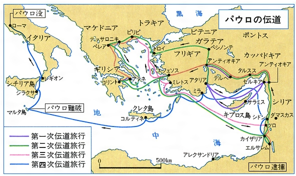 ☆年譜| 5年頃 ローマ属州キリキア州都タルソスにて、ユダヤ教ファリサイ派の家庭に誕生する。 18~30年頃 エルサレムのラビ・ガマリエル1世の元で学ぶ。 30~34年頃 キリスト教徒を激しく迫害する。 32年頃 最初のキリスト教殉教者ステファノの石打ちに立ち会う。 34年頃 ダマスコに向かう途中、降臨したイエスと会いキリスト教へ回心する。 34~36年 アラビア・エルサレム・ダマスコを巡る。 36年頃 聖バルナバの助けでエルサレムへ行き、ペトロやヤコブなどの使徒と会う。 36~44年 身の安全のため、故郷タルソスで暮らしながら説教する。 44~46年 バルナバとともにアンティオキアを拠点として布教活動を行なう。 46年頃 ユダヤで飢饉が起こり、バルナバとともにエルサレムへ救援物資を届ける。 46~48年 第1回宣教旅行として、キプロス島~小アジア南部(南ガラテア)方面を回る。 48年 使徒会議のため、エルサレムへ(エルサレム会議)。異邦人の割礼問題を解決する。 49年 アンティオキアにて、ユダヤの規律に関して使徒ペトロと衝突する。 49年 次の旅へのヨハネ・マルコの同伴を拒み、バルナバと衝突し仲違いする。 49~52年 第2次伝道旅行として、小アジア・マケドニア・ギリシア方面を回る。 50年頃 ルステラでテモテを弟子にし、旅に同行させる。 50年頃 港町トロアスで出会った医師ルカも旅に同行する。船でマケドニアへ。 50年頃 マケドニアのフィリピにてシラスとともに鞭打ちにされ投獄されるが、その晩に扉が開き解放される。テサロニケ、ベレアへと旅を続ける。ベレアにシラスとテモテを残し、アテネ・コリントへ。 50~51年 「テサロニケ人への手紙(第一、第二」」を執筆する。 51~52年 18ヶ月間、テント職人として働きながらコリントに滞在する。コリントにてシラス・テモテと合流する。 53年頃 エフェソへ。そこから海路でカイセリアとエルサレムを経由し、アンティオキアへ帰郷する。 53~58年 第3回宣教旅行として、小アジア・マケドニア・ギリシャを回る。 54~55年 宣教しながらテント職人として働き、2年間エフェソに滞在する。「コリントへの手紙」「ガラティア人への手紙」4通を執筆する。 56年 マケドニア、ギリシャ、エーゲ海の島々と沿岸地域を巡る。 57年 エルサレムに到着する。敵対するユダヤ人たちと暴動を起こし逮捕される。 58~59年 カイザリアに幽閉される。 59~60年 皇帝(カエサル)に上告するためローマへと護送されるも、マルタで船が難破する。 60~62年 ローマで自宅に軟禁される。「フィリピ人への手紙」「エフェソの信徒への手紙」「コロサイの信徒への手紙」「フィレモンへの手紙」を執筆する。 62~64年 ネロ帝により釈放され、スペイン方面への宣教を行なう。「テモテへの手紙」「ティトゥスへの手紙」を執筆する。 64年 ローマの大火が発生する。キリスト教徒大迫害が行なわれ、投獄される。 64~67年 ローマで殉教する。 出典:https://x.gd/ebWam |