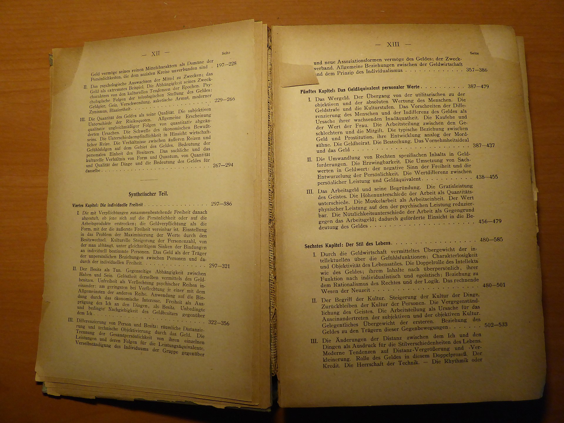 ![]() 『貨幣の哲学』第3版(ミュンヘンおよびライプツィヒ:Duncker & Humblot、1920年)の目次  |