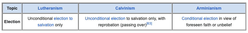 | Protestantism Comparison This table summarizes the classical views of three different Protestant beliefs.[62] ![]() 【Lutheranism】Unconditional election to salvation only 【Calvinism】Unconditional election to salvation only, with reprobation (passing over)[63] 【Arminianism】Conditional election in view of foreseen faith or unbelief |