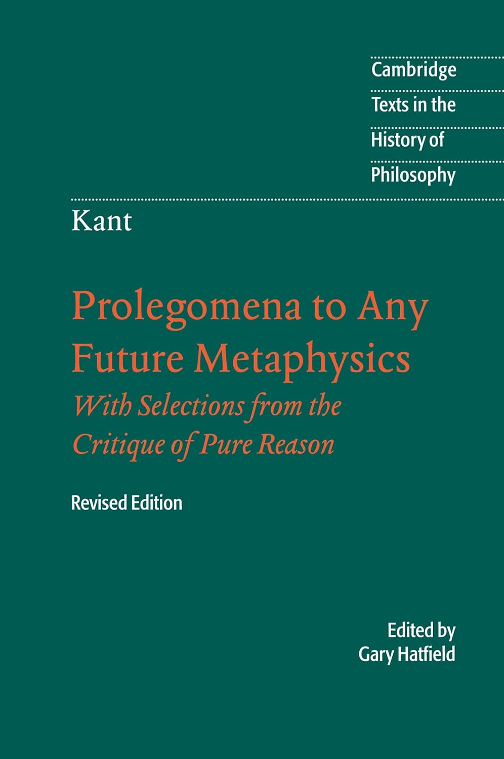 Prolegomena to any future metaphysics that will be able to come forward as science : with selections from the Critique of pure reason / Immanuel Kant ; translated and edited by Gary Hatfield, Cambridge ; New York : Cambridge University Press , 2004. - (Cambridge texts in the history of philosophy)[pdf]