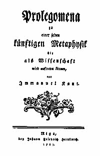 ☆『学(Wissenshaft)として現れることのできるあらゆる将来の形而上学のための序説』(独: Prolegomena zu einer jeden künftigen Metaphysik, die als Wissenschaft wird auftreten können)は、ドイツの哲学者イマヌエル・カントによる著作である。1783年に出版され、『純粋理性批判』初版から2年後のことである。カントの比 較的短い著作の一つであり、『純粋理性批判』の主要な結論を要約している。その中には『批判』では用いられなかった論証も含まれる。カントはここで、より 理解しやすいアプローチを「分析的」と特徴づけ、『批判』における「合成的」な方法、すなわち精神の諸能力とその原理を順次検討する手法と対比させてい る。[1]本書は論争を意図したものでもある。カントは『純粋理性批判』の受けが思わしくなかったことに失望しており、ここでは批判的プロジェクトが形而 上学という 科学の存在そのものにとって重要だと繰り返し強調している。末尾の付録には『純粋理性批判』に対する否定的な書評への反論が収められている(→カント『プロレゴメナ(全文)』)。