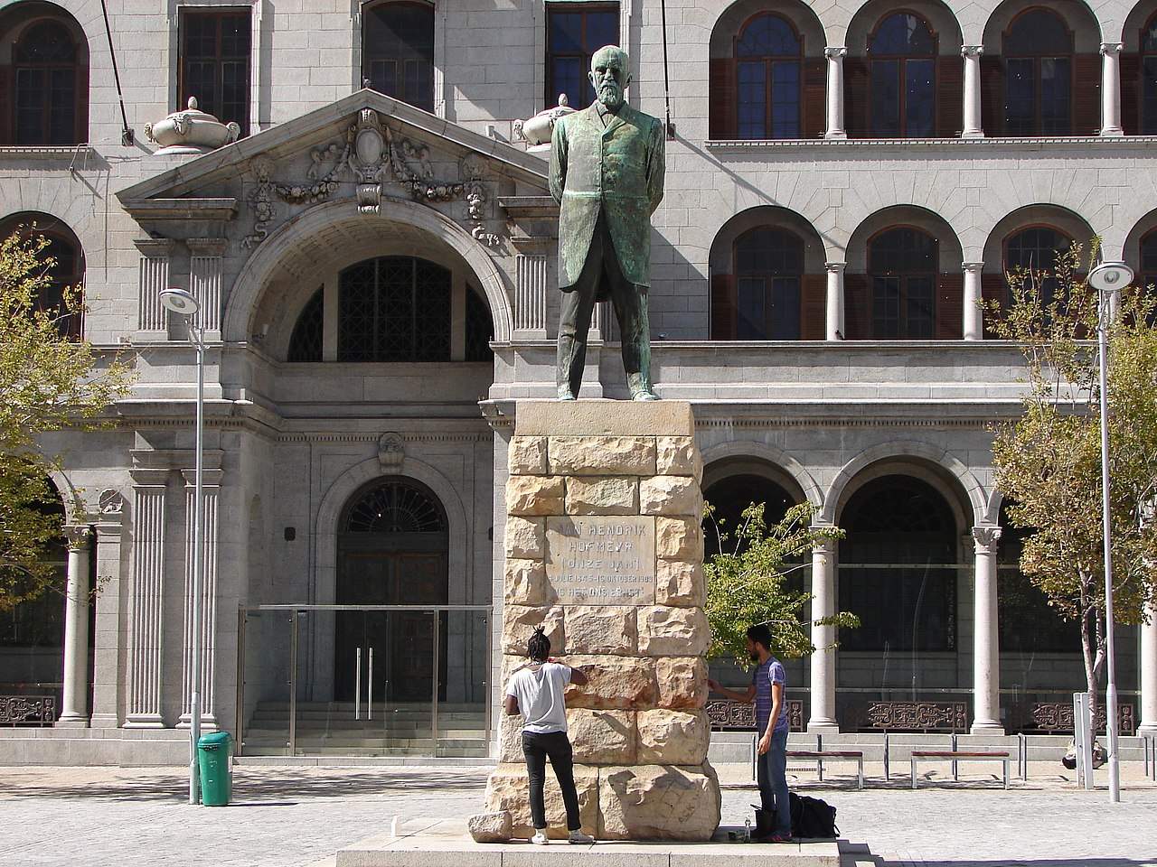 Other statues![]() The paint-smeared base of the statue of J.H. Hofmeyr in Cape Town being cleaned by a pair of non-protesting volunteers on 11 April 2015 On 22 March 2015, the EFF's president, Julius Malema, called for all other symbols of colonialism and apartheid in South Africa to be removed.[135] Following that, a number of colonial era statues across the country were vandalised, including the statue of King George V at the University of KwaZulu-Natal.[136] EFF members were implicated in the vandalism of a number of Second Boer War statues, including that on 4 April of the Uitenhage War memorial statue for fallen British troops,[137] a 6 April attack on the Horse Memorial in Port Elizabeth dedicated to the animals that served in the war,[138] and the 7 April vandalism, with green paint, of Paul Kruger's statue in Church Square, Pretoria.[139] The statue of Louis Botha situated outside the Houses of Parliament in Cape Town was vandalised on 9 April.[140] EFF spokesperson Mbuyeseni Ndlozi said on 9 April that the party would have to take responsibility for its members' actions, but that the EFF was for the removal, not vandalism or destruction, of colonial and apartheid symbols in the public space.[141] In response to the vandalism of the Louis Botha Statue and Horse Memorial, local supporters of the monuments laid wreaths at the monuments a few days afterwards. To protect it from future vandalism, the Horse Memorial was temporarily moved to a safe space by the local municipality. The chairperson of the Nelson Mandela Bay region of the EFF, Bo Madwara, threatened to "unload it into the sea" should the monument be restored.[142] On 18 September 2015, the bronze bust of Rhodes at Rhodes Memorial was vandalised. The nose was cut off and the memorial was daubed with graffiti accusing Rhodes of being a "Racist, thief, [and] murderer". It appeared that the vandals had attempted to cut off the whole head.[143] In October 2018, the nose was restored by a local artist. |
