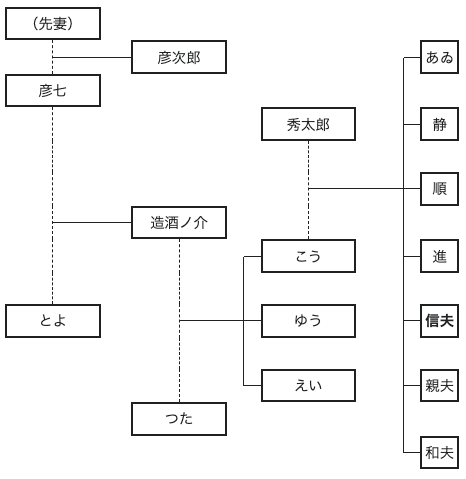 | 系譜 折口家は木津の願泉寺門徒の百姓であったが、曽祖父彦七の時から商家となり、生薬と雑貨を商った[21]。 祖父:造酒ノ介(みきのすけ)は元、大和の明日香村岡寺前の岡本善右衛門の八男であったが、同地の古社である飛鳥坐神社の累代の神主家飛鳥助信の養子と なった上で、折口家に養子として入り、医を本業として従来の家業を兼ねた。 父:秀太郎は河内国の名主の家の次男で、折口家の養子となり医を継いだ。信夫が生まれて7年のち双生児の弟が誕生するが、実は母こうが生んだのではなく て、同居する叔母ゆうと父の秀太郎との間に生まれたのであった。こうした家庭内の愛情にかかわる葛藤も、信夫の心に深い陰影を刻んだ[21]。 長兄:医者の後を継いだ[4]。 1 |