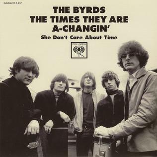 The Byrds' version![]() "The Times They Are a-Changin'" was one of two Dylan covers that the Byrds included on their second album, Turn! Turn! Turn!, "Lay Down Your Weary Tune" being the other.[15] Like other Dylan compositions that the band had covered, such as "Mr. Tambourine Man" and "All I Really Want to Do", the song was intended to be the A-side of a single. It was sung by bandleader Jim McGuinn and prominently features his signature twelve-string Rickenbacker guitar. The song was often played at concerts surrounding its release.[16] I remember the Beatles were in the studio for one of them (version of 'The Times They Are a-Changin'). That kinda put a lot of pressure on us. — Roger McGuinn[17] George Harrison and Paul McCartney of the Beatles attended the Byrds' recording of the song on September 1, 1965, at Columbia's studios on Sunset Boulevard.[18] Members of the Byrds later reflected that the presence of the two Beatles prevented them from completing the track effectively.[17][19] Columbia Records originally pressed thousands of cover sleeves for the intended single, but the Byrds' manager, Jim Dickson, asked for the release to be dropped because of the group's dissatisfaction, most vocally expressed by David Crosby; Dickson originally thought the song would have made a strong single. In a 2004 interview, Chris Hillman stated his dislike for the song, suggesting that "we shouldn't have bothered with that song".[17][20] Another version of the song, recorded in June, is a bonus track on the 1996 reissue. "Turn! Turn! Turn!" ended up becoming the band's third single, reaching number 1 on the U.S. Billboard Hot 100 chart and number 26 on the UK Singles Chart.[21][22] The Byrds performed the song on the U.S. television program Hullabaloo, but it failed to make a long-term impact.[23] CBS England issued "The Times They Are a-Changin'" as the lead track of an EP, along with "Set You Free This Time", written by Gene Clark, which was moderately successful.[24] In addition to its appearance on the Byrds' second album, "The Times They Are a-Changin'" is included on several Byrds compilations, including The Byrds' Greatest Hits Volume II, The Very Best of The Byrds, The Byrds, The Essential Byrds, There Is a Season, and The Byrds Play Dylan.[25] |