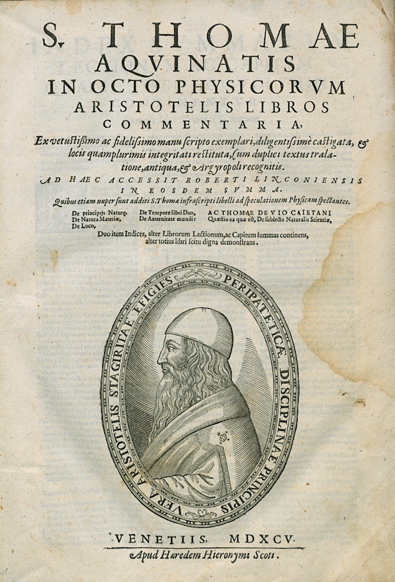 思想![]() Super Physicam Aristotelis, 1595 トマスの最大の業績は、キリスト教思想とアリストテレスを中心とした哲学を統合した総合的な体系を構築したことである。かつてはトマスは単なるアリストテレス主義者にすぎないという見方もあったが、最近の研究ではそのような見方は否定されている[25]。 トマスはアヴィケンナやアヴェロエス、アビケブロン、マイモニデスなどの多くのアラブやユダヤの哲学者たちの著作を読んで研究し、その著作においても度々 触れている[26]。そこから、トマスは単なる折衷家にすぎないとの見方も根強いものがあったが[27]、現在では、「存在」(エッセ)の形而上学がトマ ス的総合の核心であり、彼独自の思想である点に見解の一致があり、その存在をどのように解釈するかによって様々な立場に分かれるとされている[28]。 全体的にみれば、トマスは、アウグスティヌス以来のネオプラトニズムの影響を残しつつも、哲学における軸足をプラトンからアリストテレスへと移した上で、 神学と哲学の関係を整理し、神中心主義と人間中心主義という相対立する概念のほとんど不可能ともいえる統合を図ったといえる。 トマスの思想は、その死後もトマス主義として脈々と受け継がれ、近代の自然法論や国際法理論や立憲君主制にも多大な影響を与えただけでなく、19世紀末におきた新トマス主義に基づく復興を経て現代にも受け継がれている。 神学 トマスの生きた時代は、十字軍をきっかけに、アラブ世界との文物を問わない広汎な交流が始まったことにより、東ローマ帝国皇帝ユスティニアヌスの異教活動 禁止のため、一度は途絶したギリシア哲学の伝統がアラブ世界から西欧に莫大な勢いで流入し、度重なる禁止令にもかかわらず、これをとどめることはできなく なっていた。また、同様に、商業がめざましい勢いで発展し、都市の繁栄による豊かさの中で、イスラム教徒であるとユダヤ教徒であるとキリスト教徒であると を問わず、大衆が堕落していくという風潮と、これに対する反感が渦巻いていた。 トマスは、このような時代背景の下、哲学者アリストテレスの註釈家と呼ばれていたアヴィケンナやアヴェロエスとは、キリスト教の真理を弁証する護教家とし て理論的に対決する必要に迫られていた[26]。また、トマスは、同様に、アビケブロンのみならず多くのユダヤ人思想家とも対決をしなければならなかった [注 1]。トマスは、アリストテレスの存在論を承継しつつも、その上でキリスト教神学と調和し難い部分については、新たな考えを付け加えて彼を乗り越えようと したのであり、哲学は「神学の婢」(ancilla theologiae)であった。 |