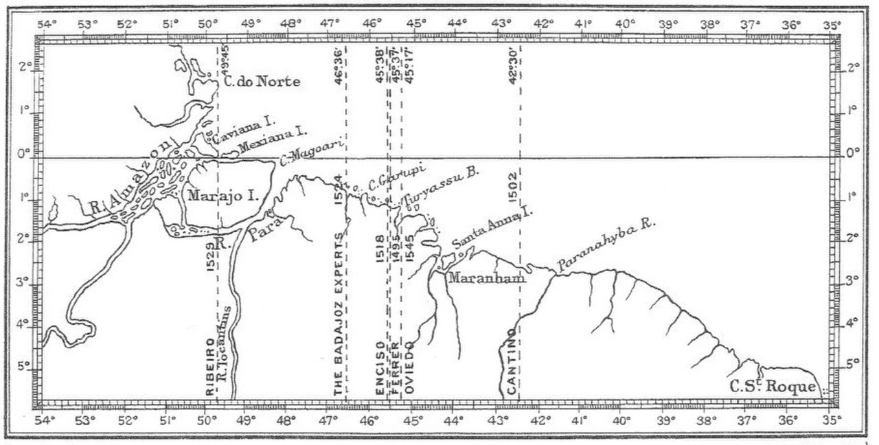 子午線の位置を確定することの難しさ 当時の航海士たちは、子午線が1度につき何哩あるかについて意見が一致しなかった。スペイン人の間では、1度につき14哩と1/6哩、15哩、16哩と 2/3哩、17哩と1/2哩、21哩と3/8哩という意見があった。ポルトガル人も同様で、1度につき18、20、25リーグの意見があった。当時、地球 球の大きさは正確にはわかっていなかったため、各子午線間の距離は球の長さによって異なり、経度1度の中にいくつの哩があるかという点では一致していたと しても、キロメートル単位での距離は地球の大きさや測定された緯度によって異なっていた。当時、北極星を四分儀やアストロラーベで観測することで緯度を決 定することは可能だったが、経度を決定するためには、海上で距離を確定する唯一の方法であり、しかも非常に不正確な方法であった。これには一定の速度が必 要で、正確な時計はなかった。 ポルトガル人は緯度による航海術を知っていたが、コロンブスをはじめとするスペインの航海士たちはコンパスを使って航海していた。コンパスの方角を一定に 保って地表を航行すれば、その航路は大円となり、一定のコースをたどった船は出発点に戻ることで世界を一周すると信じられていた。この概念は、この論文に おける「正しい」という言葉の使用にも反映されている。ペドロ・ヌネスはこの考え方の誤りを指摘し、ロクソドロミック線を発見した最初の人物で、1537 年に『航海論』と『航海に関する当時のいくつかの疑問に関する論考』を出版した。一定のコースをたどると、出発点に戻ることはできず、軌跡は漸近的にいず れかの極に近づく。当時の地図は、この誤差によって生じた歪みを、原点の子午線上の極だけを通る線を引くことによって示している。例えば、1502年のカ ンティーノのプラニスフェリオ(Planisferio)は、トルデシリャス線をポルトガルで表現した最も古いものとして知られている。この分界線は、南 アメリカ大陸の北東端にあるサン・ロケ岬とアマゾン川河口の中間地点、西経約42度30分に位置し、グリーンランド、ニューファンドランド、ラブラドール の一部をポルトガル半球に残して歪んでいる。南はさらに西に南米に入り、サンタ・マルタ岬を東に残している。条約調印当時の知識である磁気方位に基づいて 地図を作成した誤りは、ブラジルの領土を拡大したポルトガル側に有利であったため、彼らの地図と主張は支持された。 条約線の位置に関する最初のスペイン人の見解は、1495年にカタルーニャ人のジャウマ・フェレール・デ・ブラネスがカスティーリャ王とアラゴン王の要請 を受けて発表したものである。フェレールは、北緯15度(フォゴ島に相当)に位置するヴェルデ岬諸島の最も中央の島から西へ18度(1度につき 20.5/8哩)の位置に境界線を設定すべきだと考えた。これらの考察によれば、条約線は西経42度25分に設定されたが、彼は地球圏の大きさは実際より も21.1%大きいと考えていた。フェレールはまた、リーグは32オリンピック・スタディア(6.15264 km)であるべきであるとしていたため、フェレールの線はこうして子午線45°37'Wと一致した[15]。問題を解決するために彼は三角形の形をした航 海を提案したが、彼は大円の弧ではなくロキソドロミックな線によって計算したことを知らなかった[16]。 ![]() フアン・デ・ラ・コサによる地図(1500年)。上部に新世界(緑色)、中央と下部に旧世界(白色)が描かれている。 フアン・デ・ラ・コサの1500年の地図には、ヴェルデ岬諸島を通る南の線と題された極から極への線がある。これは、トルデシリャス条約に言及した最古の図形表現ではないかと推測する人もいるが、万が一、これが370哩を数える起点となる線であったとしたら。 1518年、スペイン人のマルティン・フェルナンデス・デ・エンシソは西経47度24分に線を引いたが、彼は地球球が実際よりも7.7%小さいと信じていたため、彼の線は西経45度38分を通過した[17]。  |