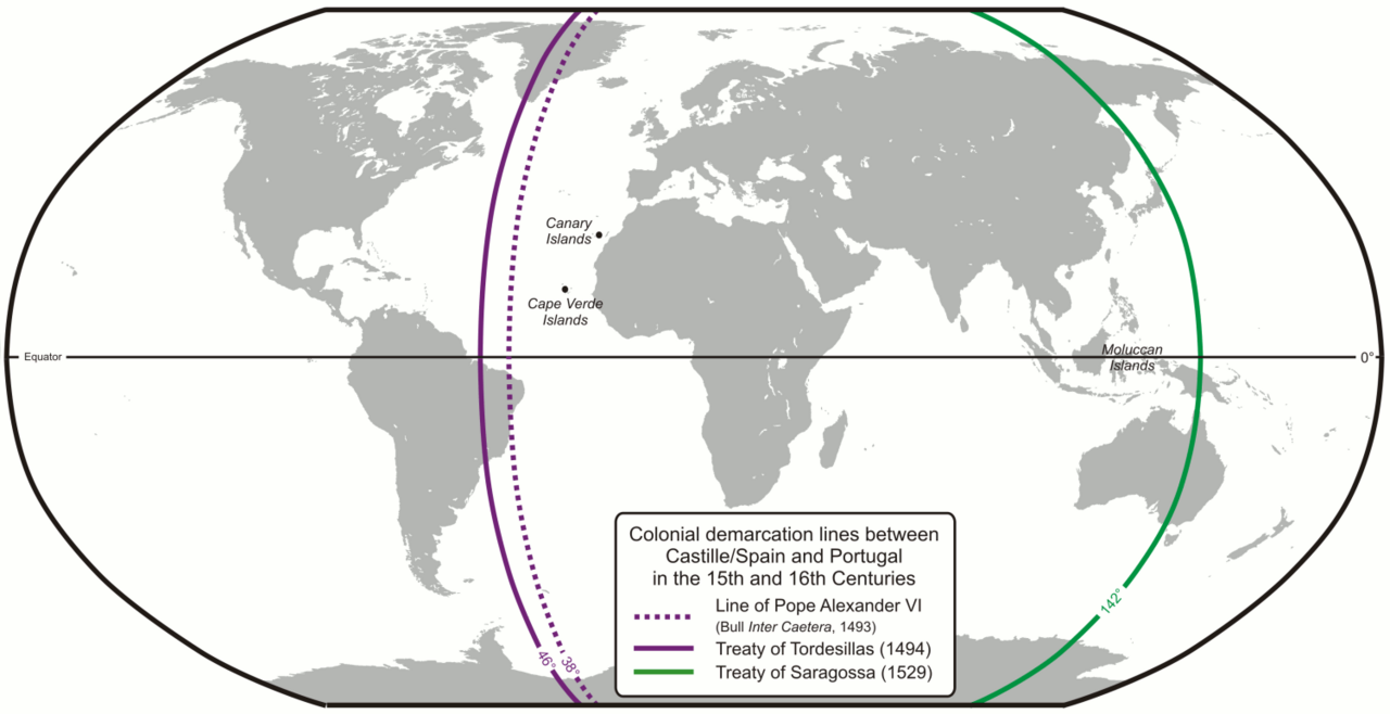 1494年のトルデシリャス条約で定められた子午線(紫)と1529年のサラゴサ条約で定められた、モルッカ諸島の子午線(緑)