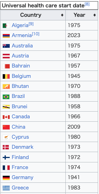 point, as rural residents were not covered. In New Zealand, a universal health care system was created in a series of steps, from 1938 to 1941.[13][14] In Australia, the state of Queensland introduced a free public hospital system in 1946. Following World War II, universal health care systems began to be set up around the world. On July 5, 1948, the United Kingdom launched its universal National Health Service. Universal health care was next introduced in the Nordic countries of Sweden (1955),[15] Iceland (1956),[16] Norway (1956),[17] Denmark (1961)[18] and Finland (1964).[19] Universal health insurance was introduced in Japan in 1961, and in Canada through stages, starting with the province of Saskatchewan in 1962, followed by the rest of Canada from 1968 to 1972.[13][20] A public healthcare system was introduced in Egypt following the Egyptian revolution of 1952. Centralized public healthcare systems were set up in the Eastern bloc countries. The Soviet Union extended universal health care to its rural residents in 1969.[13][21] Kuwait and Bahrain introduced their universal healthcare systems in 1950 and 1957 respectively (prior to independence).[22] Italy introduced its Servizio Sanitario Nazionale (National Health Service) in 1978. Universal health insurance was implemented in Australia in 1975 with the Medibank, which led to universal coverage under the current Medicare system from 1984.[citation needed] From the 1970s to the 2000s, Western European countries began introducing universal coverage, most of them building upon previous health insurance programs to cover the whole population. For example, France built upon its 1928 national health insurance system, with subsequent legislation covering a larger and larger percentage of the population, until the remaining 1% of the population that was uninsured received coverage in 2000.[23][24] Single payer healthcare systems were introduced in Finland (1972), Portugal (1979), Cyprus (1980), Spain (1986) and Iceland (1990). Switzerland introduced a universal healthcare system based on an insurance mandate in 1994.[25][22] In addition, universal health coverage was introduced in some Asian countries, including South Korea (1989), Taiwan (1995), Singapore (1993), Israel (1995) and Thailand (2001). Following the collapse of the Soviet Union, Russia retained and reformed its universal health care system,[26] as did other now-independent former Soviet republics and Eastern bloc countries. Beyond the 1990s, many countries in Latin America, the Caribbean, Africa and the Asia-Pacific region, including developing countries, took steps to bring their populations under universal health coverage, including China which has the largest universal health care system in the world[27] and Brazil's SUS[28] which improved coverage up to 80% of the population.[29] India introduced a tax-payer funded decentralised universal healthcare system that helped reduce mortality rates drastically and improved healthcare infrastructure across the country dramatically.[30] A 2012 study examined progress being made by these countries, focusing on nine in particular: Ghana, Rwanda, Nigeria, Mali, Kenya, Indonesia, the Philippines and Vietnam.[31][32] Currently, most industrialized countries and many developing countries operate some form of publicly funded health care with universal coverage as the goal. According to the National Academy of Medicine and others, the United States is the only wealthy, industrialized nation that does not provide universal health care. The only forms of government-provided healthcare available are Medicare (for elderly patients as well as people with disabilities), Medicaid (for low-income people),[33][34] the Military Health System (active, reserve, and retired military personnel and dependants), and the Indian Health Service (members of federally recognized Native American tribes). |