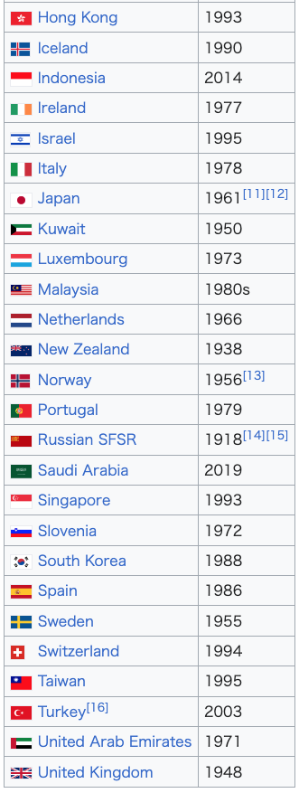 なかった。 ニュージーランドでは、国民皆保険制度が1938年から1941年までの一連のステップで創設された[13][14]。オーストラリアでは、クイーンズランド州が1946年に無料の公立病院制度を導入した。 第二次世界大戦後、世界各地で国民皆保険制度が整備され始めた。1948年7月5日、イギリスは国民皆保険制度を開始した。次に、北欧のスウェーデン (1955年)[15]、アイスランド(1956年)[16]、ノルウェー(1956年)[17]、デンマーク(1961年)[18]、フィンランド (1964年)で国民皆保険制度が導入された[19]。日本では1961年に国民皆保険制度が導入され、カナダでは1962年にサスカチュワン州を皮切り に、1968年から1972年までカナダ全土で段階的に導入された[13][20]。1952年のエジプト革命後、エジプトで公的医療制度が導入された。 東欧圏諸国では、中央集権的な公的医療制度が設立された。クウェートとバーレーンはそれぞれ1950年と1957年(独立前)に国民皆保険制度を導入した [22]。イタリアは1978年に国民保健サービス(Servizio Sanitario Nazionale)を導入した。オーストラリアでは、1975年にメディバンクによって国民皆保険が導入され、1984年からは現在のメディケア制度に よる国民皆保険につながった[要出典]。 1970年代から2000年代にかけて、西欧諸国は国民皆保険を導入し始めたが、そのほとんどは、それまでの健康保険制度を基礎にして、全人口をカバーす るようにしたものであった。例えば、フランスは、1928年の国民健康保険制度を基礎として、その後の法律によって、より多くの人口の割合をカバーするよ うになり、2000年には、無保険であった人口の残りの1%が保険適用を受けるまでになった[23][24]。フィンランド(1972年)、ポルトガル (1979年)、キプロス(1980年)、スペイン(1986年)、アイスランド(1990年)では、単一支払い医療制度が導入された。スイスは1994 年に保険義務に基づく国民皆保険制度を導入した[25][22]。さらに、韓国(1989年)、台湾(1995年)、シンガポール(1993年)、イスラ エル(1995年)、タイ(2001年)など、アジアのいくつかの国では国民皆保険制度が導入された。 ソビエト連邦崩壊後、ロシアは国民皆保険制度を維持・改革し[26]、他の現在独立した旧ソビエト共和国や東欧圏諸国も同様であった。 1990年代以降、発展途上国を含むラテンアメリカ、カリブ海諸国、アフリカ、アジア太平洋地域の多くの国々が、世界最大の国民皆保険制度を有する中国 [27]や、国民の80%まで保険適用率を向上させたブラジルのSUS[28]など、国民を国民皆保険制度の下に置くための措置を講じた[29]: ガーナ、ルワンダ、ナイジェリア、マリ、ケニア、インドネシア、フィリピン、ベトナムの9カ国である[31][32]。 現在、ほとんどの先進国と多くの発展途上国は、国民皆保険を目標に、何らかの形で公的資金による医療を運営している。全米医学アカデミーなどによると、米 国は裕福な先進国で唯一、国民皆保険を提供していない。政府が提供する医療は、メディケア(高齢者と障害者向け)、メディケイド(低所得者向け)[33] [34]、軍保健制度(現役、予備軍、退役軍人とその扶養家族)、インディアン保健サービス(連邦公認のアメリカ先住民部族のメンバー)だけである。 |