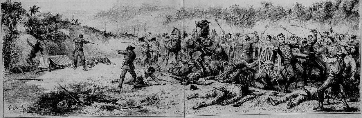 第二の軍事作戦 最初の軍事作戦 ![]() 1897年、カナウドスの反乱を鎮圧するためパラ州から派遣された第40歩兵大隊 カナウドスが最終的に滅ぼされるきっかけとなった事件は、木材の配達をめぐる争いだった。コンセルヘイロは、新しい教会を建設するため、よく取引のある隣 町ジュアゼイロの業者に木材を発注していた。[3] しかし新任の地方判事アルリンド・レオニがコンセルヘイロに反対し、納品を阻止した。[3] これに対し一部のカヌード住民が自らジュアゼイロへ木材を取りに行くことを決めた。[3] この計画を知った判事は州知事ルイス・ヴィアナに警察部隊の派遣を要請し、コンセルヘイロとその追随者による町への「侵略」が差し迫っていると主張した。 [3] ビアナはレオーニから「噂が流れており、それなりに根拠もあるという。つまり、繁栄するこの町[ジュアゼイロ]が数日中にアントニオ・コンセルヘイロの信 奉者たちに襲撃されるというのだ」と報告を受けたと記している。[3] ![]() アンソニー・コンセルヘイロが、古式ゆかしい散弾銃を携えた道化師の随行団と共に共和国を阻止しようとする風刺画(『リヴァイスタ・イリュストラダ』誌、1896年頃)。キャプションには「[彼は]共和国にこう言い放つ勇気すらある:『待て!通すものか…』」とある。 当初、軍隊は襲撃阻止のみを目的に派遣されたが、レオニは指揮官ピレス・フェレイラを説得し、カヌードスへの進軍を決行させた[3]。地形や住民の防衛手 段に関する情報が乏しい中、フェレイラ率いる100名の小部隊が1896年11月4日、集落へ向けて出撃した[12]。しかし宗教集落からジュアゼイロへ 向かうカヌデス人部隊がウアワで軍隊を奇襲し、激しい戦闘が発生した[3]。戦闘に参加したコンセルヘイリスタ(カヌデス側)の兵力は1,000人から 3,000人と推定され、記録によれば「古びたマスケット銃、槍、鎌、長い棒、農具」で武装していたとされる。[3] カヌデンセスは150名と推定される相当な損害を出しながらも、州警察兵を撃退した。[3] 兵士たちはジュアゼイロへ撤退し、バイア州からの増援を待った。[12] 政府と地元メディアは、バイア州奥地での兵士の敗北を即座に公表した。メディア(すなわち新聞)は、この紛争を激化させる上で重要な役割を果たし、コンセ ルヘイリスタ派が単なる地方の未熟な反乱ではなく、他の王党派と結託して王政「復古」を企てているという噂を広めた。[13] 不安定な政治情勢と軍事資源の不足から、バイア州政府は連邦政府に支援を要請し、脅威を増す入植地を鎮圧しようとした[5]。第一ブラジル共和国が成立し たばかりの時期であったため、反乱を起こした入植者たちを権威に対する王党派かつ分離主義的な脅威と見なし、見せしめとする必要があったのである。 [14] 当時のブラジル大統領プルデンテ・デ・モライスが、カヌードスへの懲罰的軍事遠征を再び命じた。フェレイラが再び指揮する104名の第二部隊は1896年 11月に準備を開始し、同年11月21日に集落を攻撃した。[12] 500名の武装集団がアントニオ・コンセレイロと君主制を称えながら集落を激しく防衛したため、攻撃部隊は最初の遠征と同様の問題に直面した。ブラジル軍 兵士は、マチェテ、原始的な槍、斧しか持たない入植者約150名を殺害したものの、甚大な損害を被って撤退した。[12] |