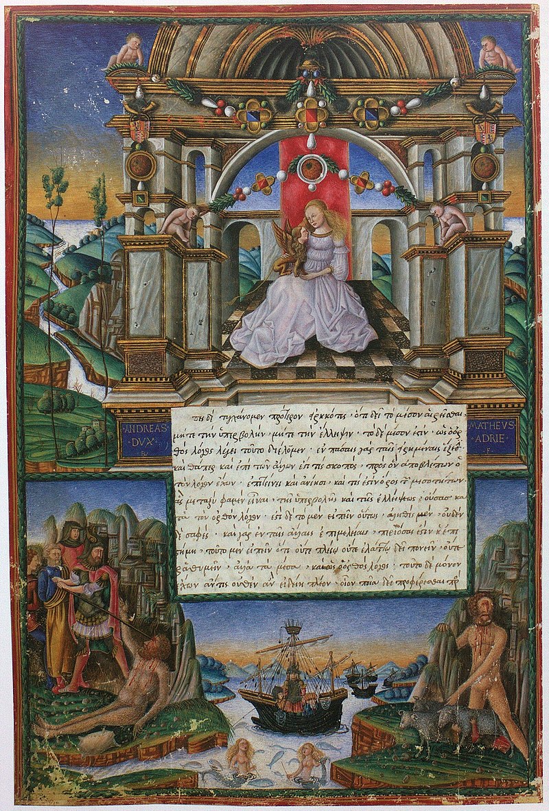 1837年版の最初のページ/ ニコマコス倫理学の第6巻の冒頭部分。南イタリアのアトリ公アンドレア・マッテオ・アクアヴィーヴァのために作成された写本。オーストリア国立図書館(ウィーン)所蔵、Cod. phil. gr. 4、fol. 45v(15世紀後半)。
