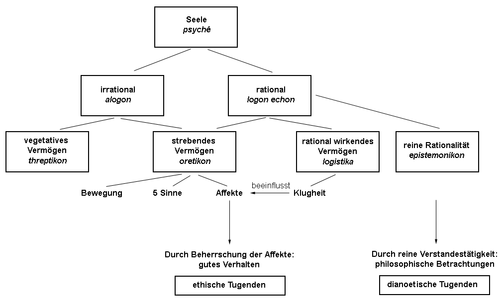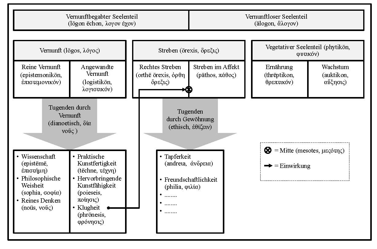 | Tugenden Die Tugenden sind seelische Güter. Aristoteles teilt diese entsprechend der Seele in dianoetische Tugenden, welche aus Belehrung entstehen, und ethische Tugenden, die sich aus der Gewohnheit ergeben. In Analogie zum Beherrschen eines Musikinstruments erwirbt man die Tugenden, indem man sie ausübt. Einteilung der Seele ![]() Schaubild der Seele nach Aristoteles ![]() Schaubild: Seelenlehre des Aristoteles (Nikomachische Ethik) Aristoteles unterteilt die Seele in einen spezifisch menschlichen, vernunftbegabten Teil (λόγον ἔχον) und einen vernunftlosen Teil (ἂλογον). Der vernunftlose Seelenteil (ἄλογον) besteht aus einem vegetativen Teil, der sich aus Wachstum (αὔξησις) und Ernährung (θρεπτικόν) zusammensetzt, aber auch das Strebevermögen der Seele beherbergt (ὂρεξις). Bis hierher ist der Mensch mit den Pflanzen bzw. Tieren auf einer Stufe, es sind nur Herzschlag und Stoffwechsel sowie Wachstum und Fortpflanzung sichergestellt. Der Mensch ist jedoch auch ein vernunft- und sprachbegabtes Wesen (ζῷον λόγον ἔχον), sein Strebevermögen (ὂρεξις) ist mit dem vernünftigen Teil der Seele verbunden. Deswegen kann er die Gemütsbewegungen wie Furcht, Zorn, Mitleid und andere zwar nicht in ihrem Aufkommen kontrollieren, wohl aber in der weiteren „Verarbeitung“. Der vernunftbegabte Teil hat ebenso wie der vernunftlose Anteil am Strebevermögen und ist „Ort“ der menschlichen Vernunft (λόγος). Diese besteht aus zwei Teilen: Der sich selbst genügenden Vernunft (ἐπιστημονικόν) und der angewandten Vernunft, also Überlegung (λογιστικόν) und Beratung (βουλευτικόν). In der selbstgenügsamen Vernunft (ἐπιστημονικόν) geht es um Wissenschaft (ἐπιστήμη), philosophische Weisheit (σοφία) und das reine Denken, das – losgelöst von allem – völlige geistige Selbstreferentialität bedeutet (νοῦς). Sie bezieht sich auf die unveränderlich seienden Dinge, auf die Mathematik, den Kosmos und die Metaphysik. In der angewandten Vernunft geht es um praktische Kunstfertigkeit (τέχνη), herstellende Kunstfertigkeit (ποίησις) und Klugheit (φρόνησις). Sie bezieht sich auf das praktische Leben. Die Klugheit (φρόνησις) spielt eine große Rolle, denn sie wirkt sich wieder auf das Strebevermögen aus. Während alle bisherigen Tugenden dianoetisch waren, sich also direkt aus der Vernunft ergeben haben, entstehen im Zusammenspiel von Klugheit (φρόνησις) und Strebevermögen (ὂρεξις) die ethischen Tugenden, die durch Entschluss (προαίρεσις) und Gewöhnung (ἐθίζειν) zur Haltung (ἕξις) werden können. Die Klugheit (φρόνησις) bringt die affektiven Extreme, die im Strebevermögen (ὂρεξις) aufkommen, in eine tugendhafte Mitte (μεσότης). So bewirkt sie beispielsweise, dass der Mensch weder zu feige noch zu tollkühn in seiner Haltung ist, weder zu gefallsüchtig noch zu streitsüchtig. Tugendhaft sein bedeutet bei Aristoteles nicht, frei von Affekten zu sein, sondern seine eigenen Affekte zu beherrschen. |