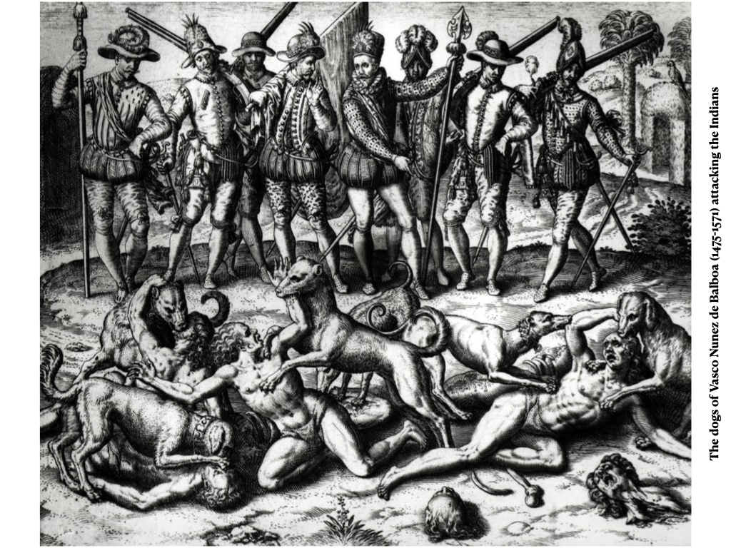 ◎もっとも初期の喰人風景の木版画イラスト: Original 1557 Hans Staden woodcut of the Tupinambá portrayed in a cannibalistic feast; Staden is the naked bearded man at right labeled "H+S"