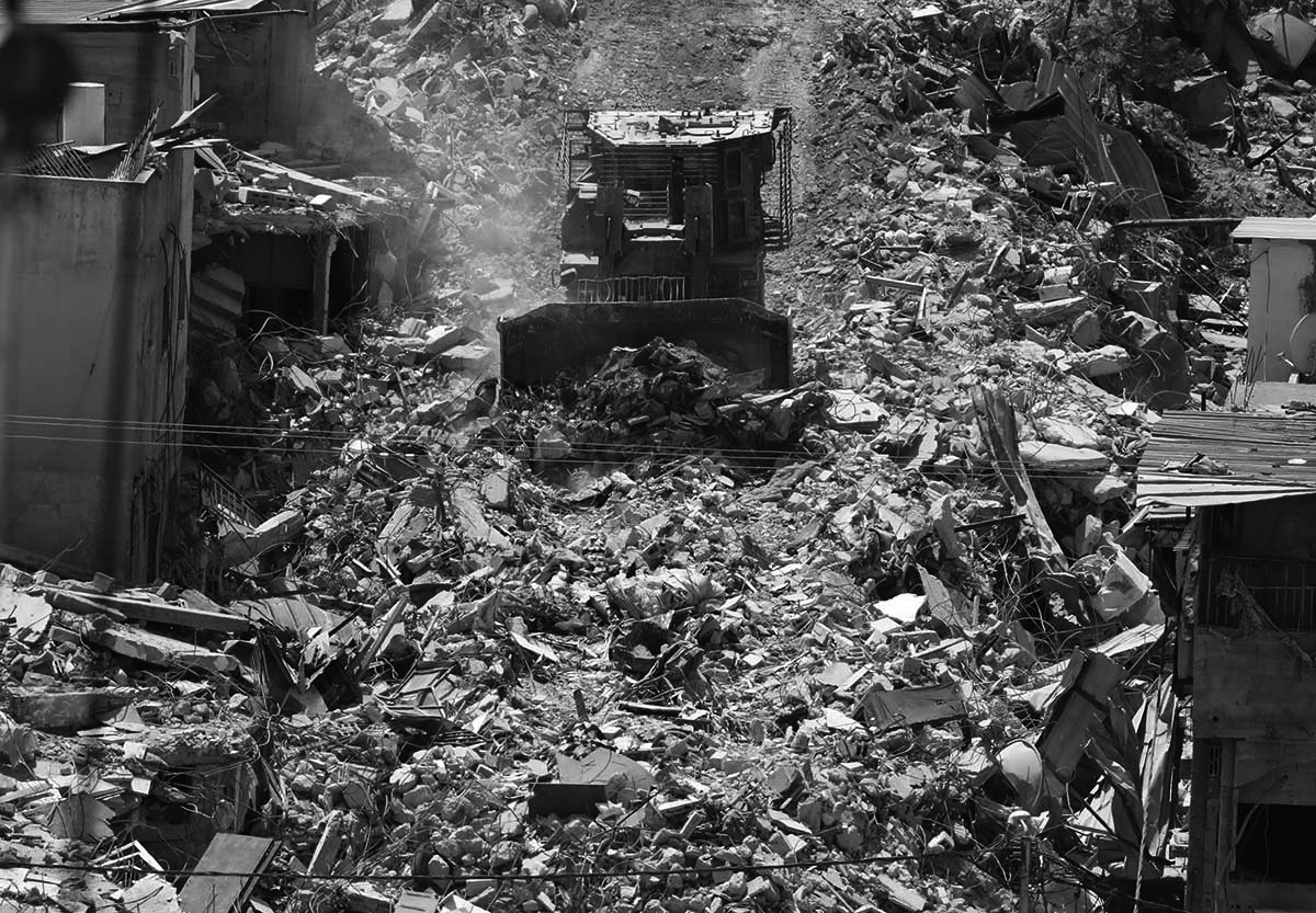 解体、インフラの破壊、資源の接収に用いられていた重機は、ガザの都市空間を消し去り、追放された住民の帰還と共同体再建を阻むために転用されている。 |