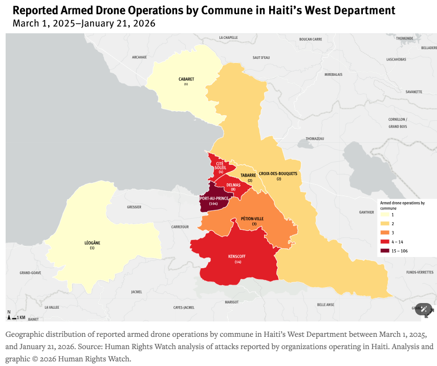 from multiple sources concerning the operations. ![]() Geographic distribution of reported armed drone operations by commune in Haiti’s West Department between March 1, 2025, and January 21, 2026. Source: Human Rights Watch analysis of attacks reported by organizations operating in Haiti. Analysis and graphic © 2026 Human Rights Watch. https://www.hrw.org/news/2026/03/10/haiti-drone-strikes-put-residents-at-risk |