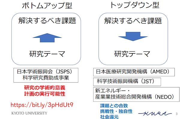 表されるような、1)ボトムアップ型研究と、JSTやNEDOなどの組織が募集するような、2)トップダウン型のものがある。 |