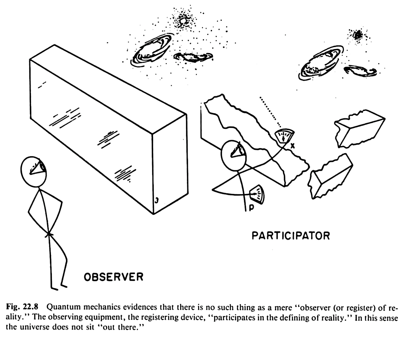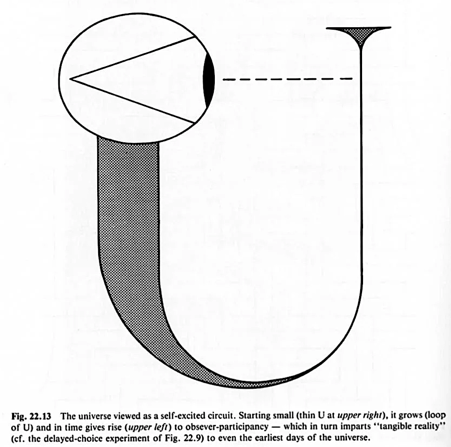量子ホール効果 ・BEYOND THE BLACK HOLE by John Archibald Wheeler, 1980. ![]() ![]() 参加者が実験で切り込むことで初めて宇宙が現れるという図 ※言い方を変えると量子力学の登場により古典物理学の世界観が限定的なものであることが明らかになった。 |