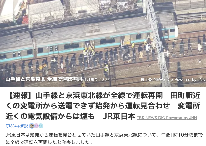 「JR東日本は始発から運転を見合わせていた山手線と京浜東北線について、午後1時10分頃までに全線で運転を再開したと発表」TBS