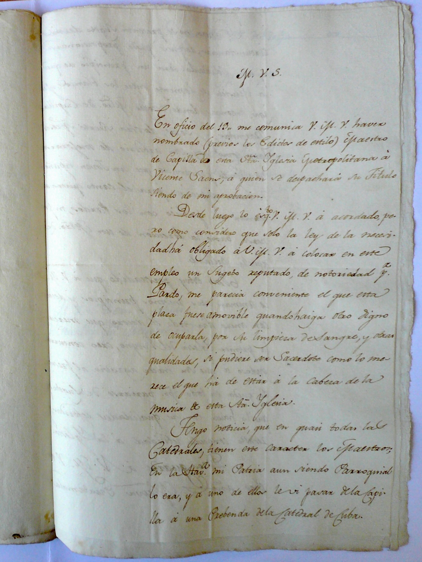 | “Muy venerable señor: En oficio del 19 me comunica vuestra merced venerable haber nombrado (previos los edictos de estilo) maestro de capilla en esta santa iglesia metropolitana a Vicente Sáenz, a quien se despachará su título, siendo de mi aprobación. Desde luego lo es, cuanto vuestra merced venerable ha acordado, pero como considero que solo la ley de la necesidad ha obligado a vuestra merced venerable a colocar en este empleo un sujeto reputado de notoriedad por pardo, me parecía conveniente el que esta plaza fuese amovible cuando haiga otro digno de ocuparla por su limpieza de sangre y otras cualidades; si pudiere ser sacerdote, como lo merece el que ha de estar a la cabeza de la música de esta santa iglesia. Tengo noticia que en cuasi todas las catedrales tienen este carácter los maestros. En La Habana, mi patria, le vi pasar de la capilla a una prebenda de la catedral de [Santiago de] Cuba”. • Se refiere a Esteban Salas (1725-1803) ![]() https://x.gd/Iz0I7 |