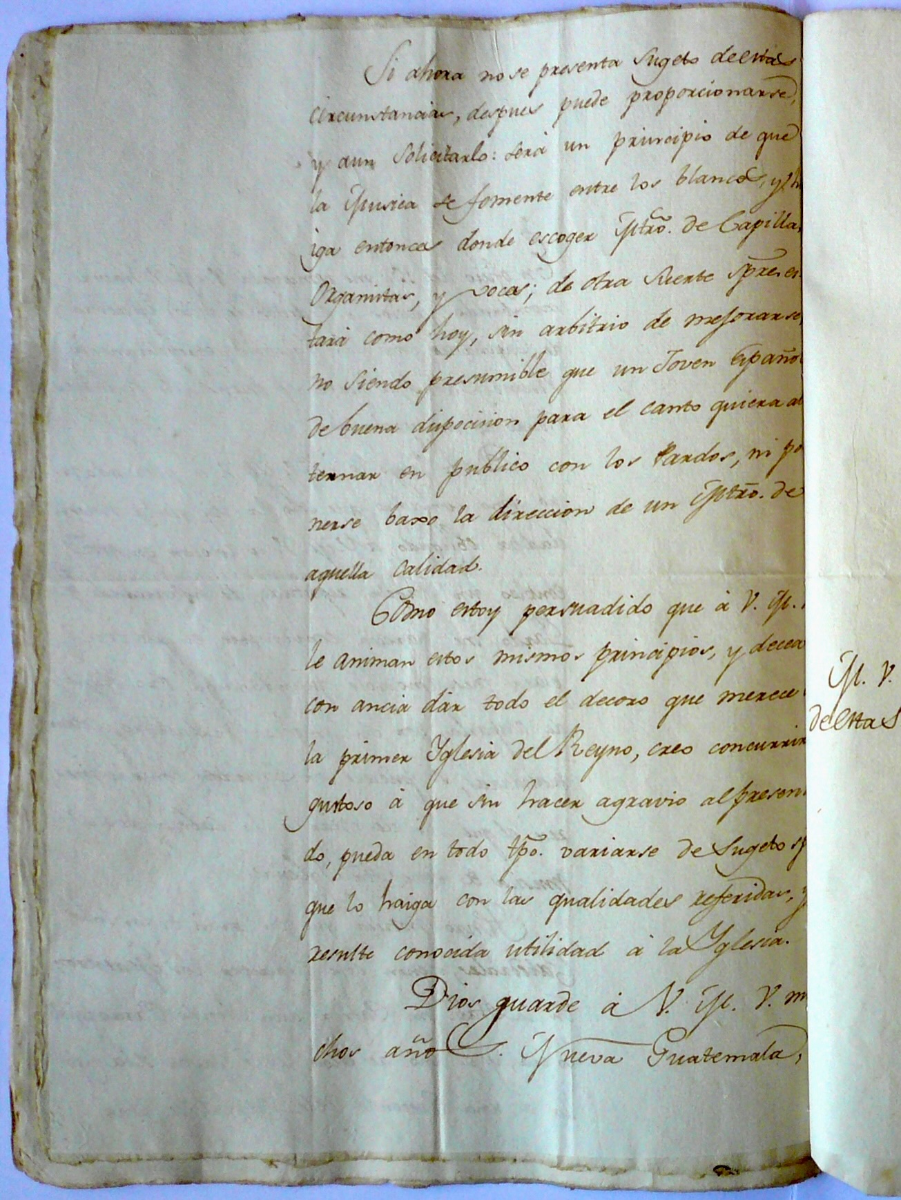 り、そのような質の指揮者の指導を受けたりすることを望まないだろう。 私は、尊い閣下も同様の考えをお持ちであると確信しており、王国で最も重要な教会にふさわしい威厳を熱望していることから、現在の教師に不利益を与えるこ となく、上記の資質を備えた人物が教会に明らかに有益であると認められる場合は、いつでも教師を変更できることに喜んで同意する。 神が貴殿を長きにわたり守られますように。ヌエバ・グアテマラより… ![]() |