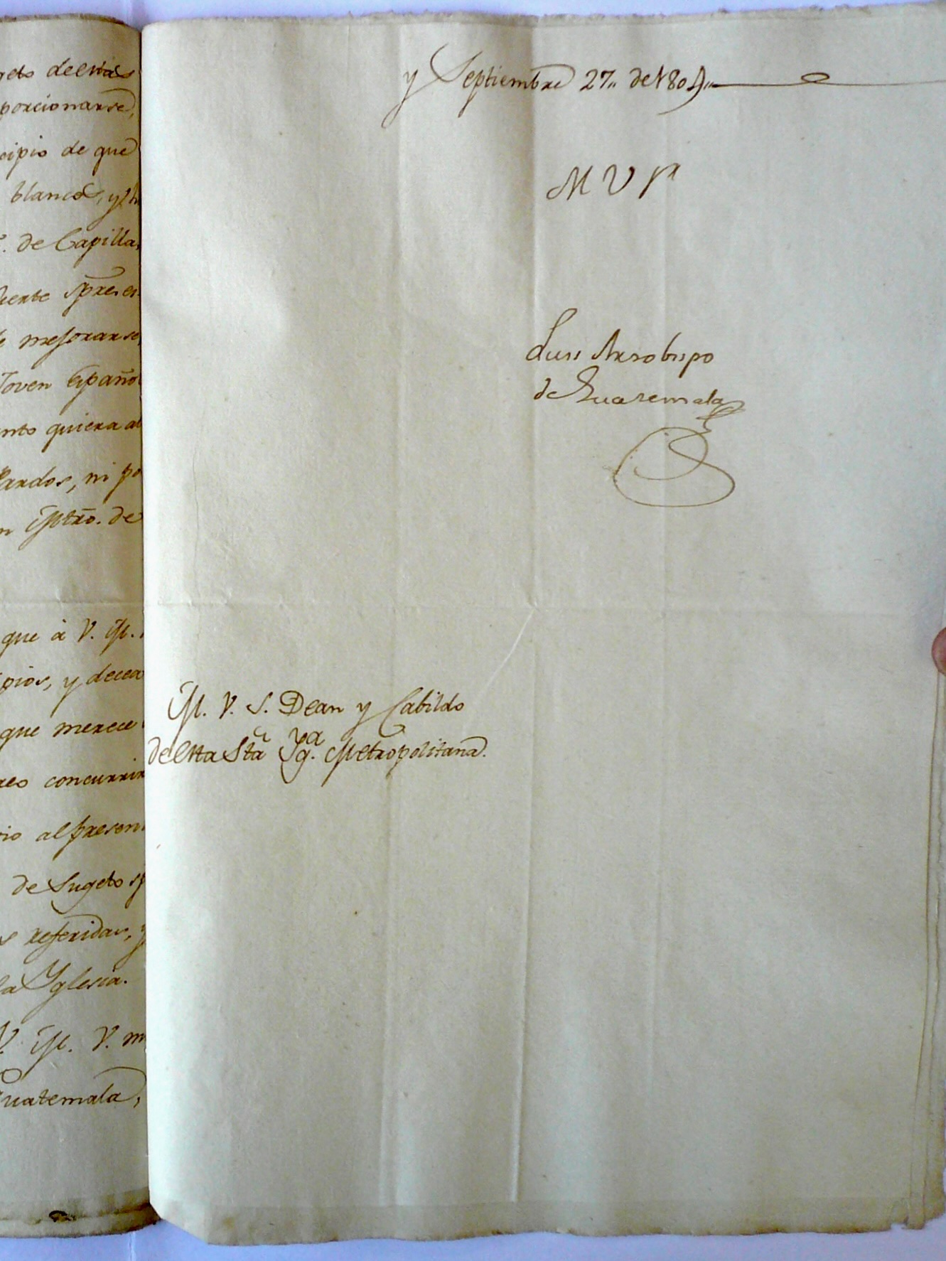| “…y septiembre 27 de 1804. Muy venerable señor Luis, arzobispo de Guatemala [Rúbrica] [Destinatario:] Muy venerable señor deán y cabildo de esta santa iglesia metropolitana”. ![]() |