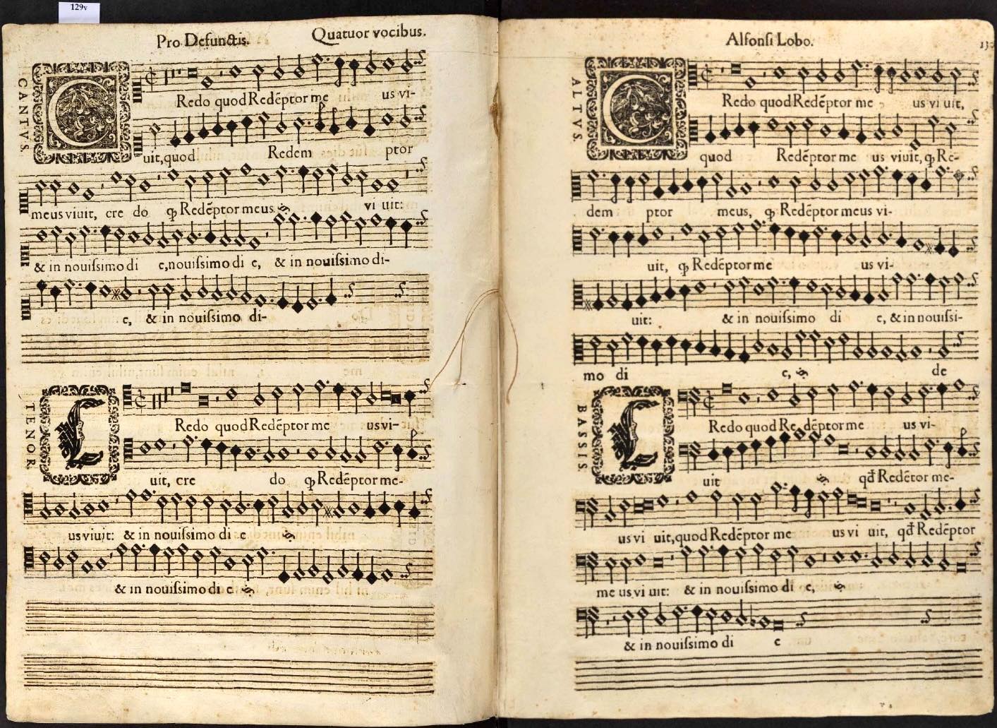 ![]() Inicio del «Credo quod Redemptor» en el «Liber Primus Missarum» de Alonso Lobo de Borja, impreso en Madrid el año 1602, cuando era maestro de capilla de la catedral de Toledo. El índice del libro incluye esta obra bajo el rubro "Moteta ex devotione inter missarum solemnia decantanda". Imagen del ejemplar que perteneció a la catedral de México y ahora se conserva en el Museo Nacional del Virreinato (Tepotzotlán), disponible en la mediateca del Instituto Nacional de Antropología e Historia. |