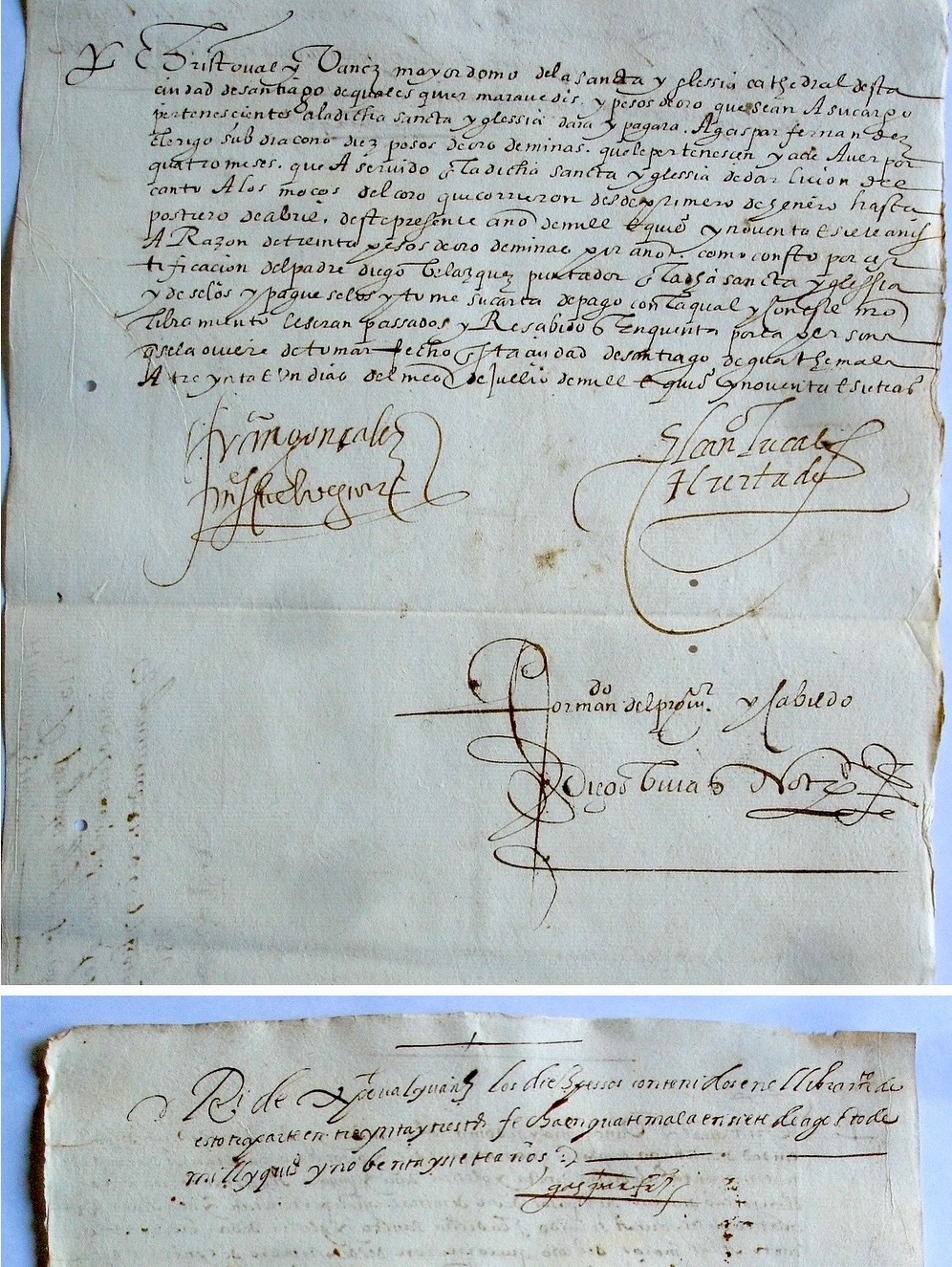 ![]() ガスパール・フェルナンデスの支払証明書と支払通知書、1597年。 • 支払証明書:「クリストバル・イバニェス、この都市サンティアゴ(グアテマラ)の聖なる大聖堂の執事長は、その責任下にある、当該聖なる教会に属するあら ゆるマラベディスおよび金ペソを、副助祭であるガスパール・フェルナンデスに支払う。10ペソの金貨を支払う。これは、同聖堂で4か月間、聖歌隊の少年た ちに歌の指導を行ったことに対する報酬である。指導期間は、1597年1月1日から4月30日までである。年間30ペソの金貨に相当する金額を支払わなけ ればならない。これは、同聖教会の会計係であるディエゴ・ベラスケス神父による証明により確認されている。そして、その金額を支払い、その支払証明書を受 け取らなければならない。その支払証明書と、この我々の支払許可証をもって、その金額は、それを受け取る者によって、会計処理され、受領されるものとす る。1597年7月31日、グアテマラの都市サンティアゴにて作成。 グアテマラの学校長、フランシスコ・ゴンサレス [署名] カノニコ、ルーカス・ウルタド [署名] プロヴィソールおよびカビルドの命令により、公証人ディエゴ・ビバス [署名]」。 • 支払証明書:「クリストバル・イバニェスから、この支払命令書に記載された10ペソを、33トストンで受け取った。1597年8月7日、グアテマラにて。ガスパール・フェルナンデス [署名]」。 |