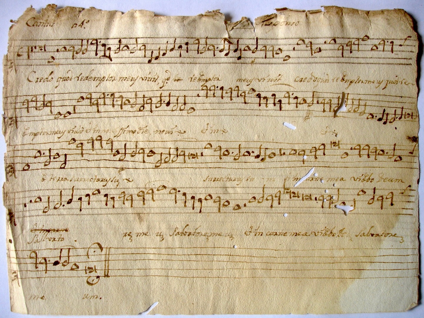 | «Credo quod redemptor» Motete de Difuntos copiado en la catedral de Guatemala por el maestro oaxaqueño Juan Fernández de León, en algún momento entre 1717 y 1731. • Aunque el encabezado de las partes dice “responso” y la portada añadida por Manuel José de Quirós a mediados del siglo XVIII también lo identifica como “Responsorio de Difuntos”, sólo está puesto en música el cuerpo del responsorio, sin el verso ni la llamada a la repetición de la pressa, por lo que parece haber sido originalmente concebido para funcionar como motete. • Justamente como motete aparece la misma música en el «Liber Primus Missarum» de Alonso Lobo de Borja (ca.1555 - 1617), estampado en Madrid el año 1602. Se conservan 21 ejemplares del impreso de Alonso Lobo en distintos repositorios de España, Italia, Portugal y México (incluyendo la catedral de Oaxaca, primer lugar de trabajo del copista de los papeles guatemaltecos); también en cuatro libros manuscritos de sendas ciudades españolas, según refiere Javier Marín López en «Los libros de polifonía de la Catedral de México. Estudio y catálogo crítico». https://x.gd/RFj4w |