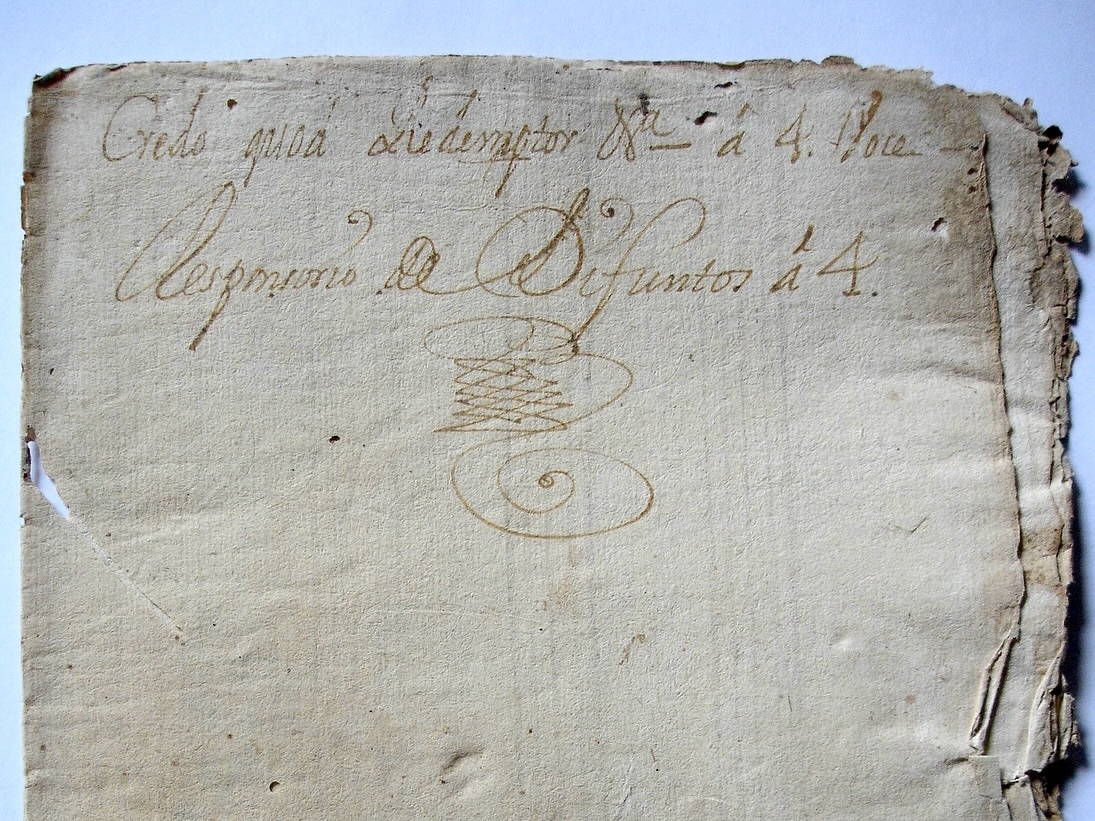 ![]() Portada detrás de la parte de Alto: "Credo quod Redemptor, etcétera, a 4 voces. Responsorio de Difuntos, a 4". Debajo de los datos de portada está la rúbrica de Manuel José de Quirós, maestro de capilla de la catedral de Guatemala entre 1738 y 1765. |