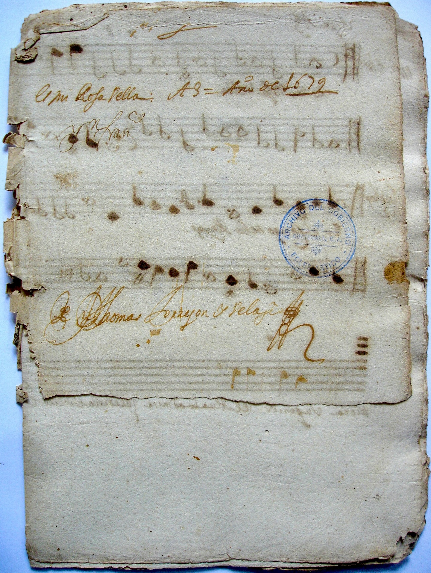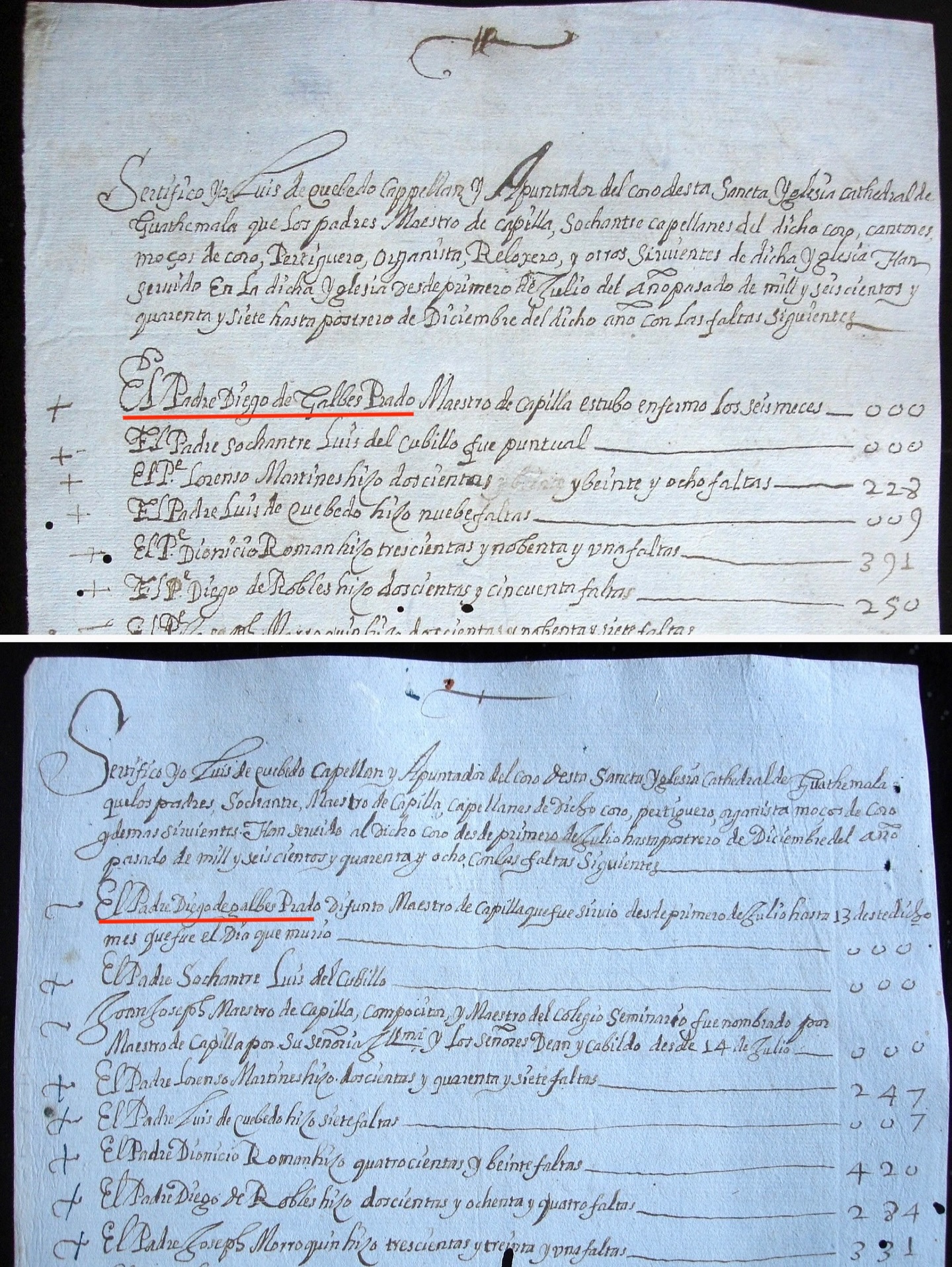 ![]() Dos certificaciones del apuntador del coro. • Certificación de 1647: “Certifico yo, Luis de Quevedo, capellán y apuntador del coro de esta santa iglesia catedral de Guatemala, que los padres maestro de capilla, sochantre, capellanes del dicho coro, cantores, mozos de coro, pertiguero, organista, relojero y otros sirvientes de dicha iglesia han servido en la dicha iglesia desde primero de julio del año pasado de mil y seiscientos y cuarenta y siete hasta postrero de diciembre del dicho año, con las faltas siguientes: - El padre Diego de Gálvez Prado, maestro de capilla, estuvo enfermo los seis meses. […]” • Certificación de 1648: “Certifico yo, Luis de Quevedo, capellán y apuntador del coro de esta santa iglesia catedral de Guatemala, que los padres sochantre, maestro de capilla, capellanes de dicho coro, pertiguero, organista, mozos de coro y demás sirvientes han servido al dicho coro iglesia desde primero de julio hasta postrero de diciembre del año pasado de mil y seiscientos y cuarenta y ocho, con las faltas siguientes: - El padre Diego de Gálvez Prado, difunto, maestro de capilla que fue, sirvió desde primero de julio hasta 13 de este dicho mes, que fue el día que murió. - El padre sochantre Luis del Cubillo - Juan José [Guerrero], maestro de capilla, compositor y maestro del colegio seminario, fue nombrado por maestro de capilla por su señoría ilustrísima y los señores deán y cabildo desde 14 de julio. […]” |