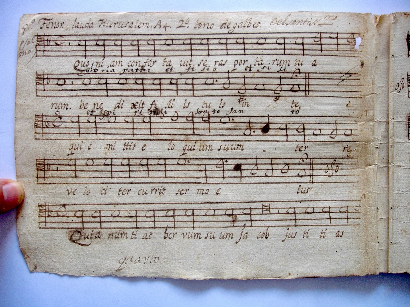 ![]() テノール。ラウダ・イエルサレム、4声部、第2調。デ・ガルベス作。 右上隅に追加:「第5詩篇」。 見出しに追加、フアン・ホセ・ゲレロ(1644-1669年頃)の筆跡:「至聖なるものより」。 • 偶数節のポリフォニック版。 |