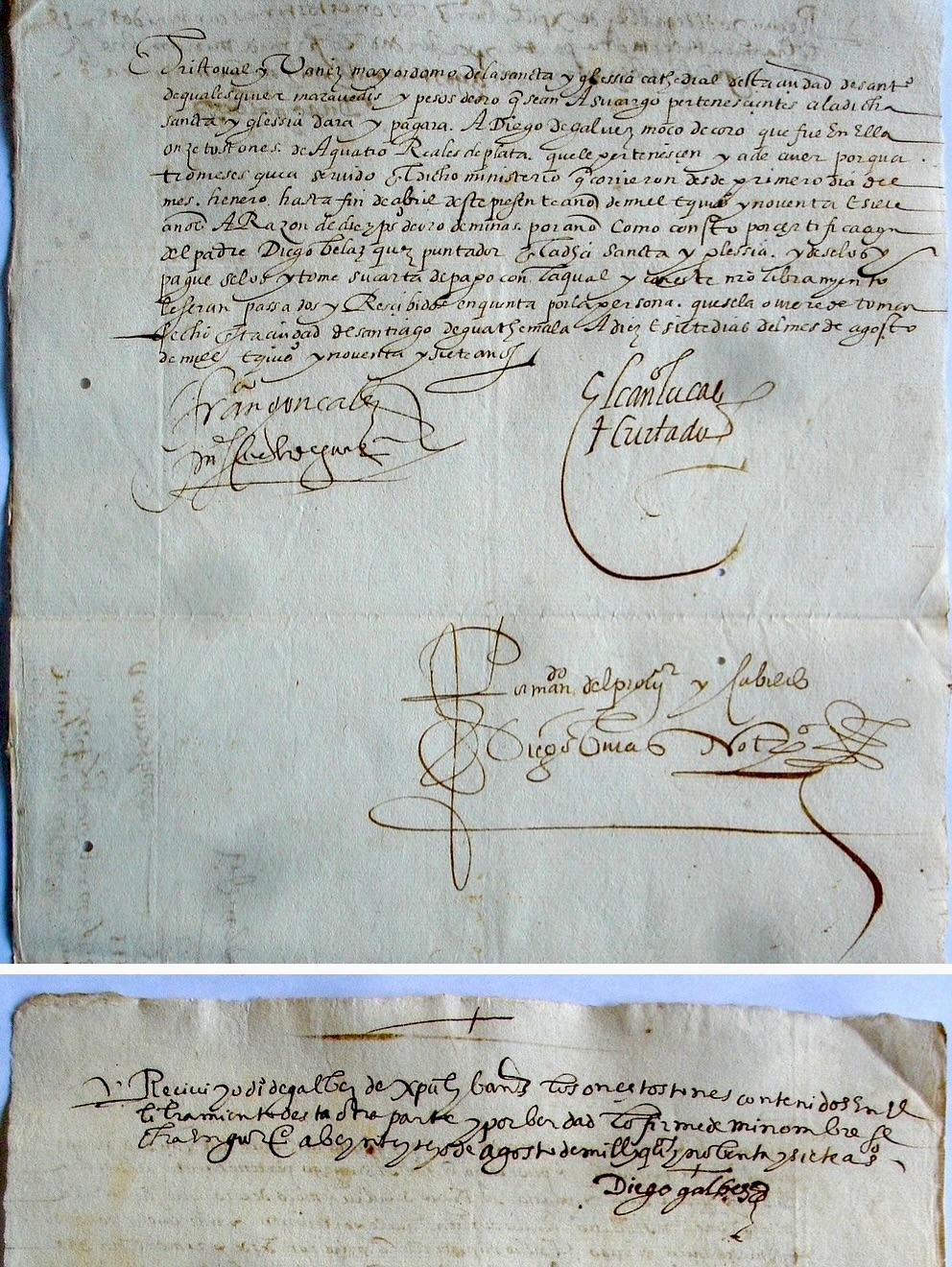 ![]() ディエゴ・デ・ガルベス・プラドによる手形と支払書、1612年。 • 支払通知書:「グアテマラ市の聖大聖堂の執事であるフランシスコ・デ・ヘレス・セラーノ殿、貴殿が管理している、同聖大聖堂に属するあらゆるマラベディス および金ペソについて、同市の神学校生であり、同聖堂の聖歌隊員であるディエゴ・デ・プラドに、 8トストンを支払うこと。これは、4月1日から6月末までの3か月間、同聖歌隊の歌手として勤務した報酬として、年間10ペソの賃金に基づき、同期間勤務 したことによるものである。これは、礼拝堂の師であり聖歌隊の指揮者であるディエゴ・ベラスケス神父による証明により確認されている。この証明と支払証明 書をもって、当該財産が引き渡された時点で、その金額は貴殿の口座に受け取られ、計上される。グアテマラにて、1612年7月8日に作成。 学校長マルティン・デ・カルバハル [署名] カノニコ・ドン・ロレンソ・デ・アヤラ・ゴドイ [署名]。 ディーンおよびカビルドの命により、公証人アロンソ・ドゥアルテ [署名]」。 • 支払証明書:「この支払証明書に記載された8トストンを受け取った。1612年7月12日作成。ディエゴ・デ・ガルベス・プラド [署名]」。 |