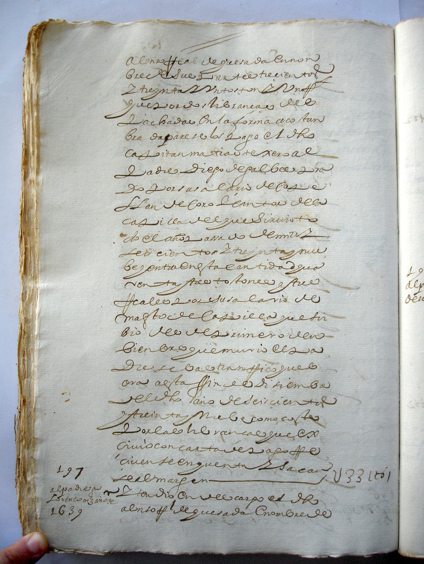 ![]() 1639年の工場帳簿の記録: • 「[…] 331トストンと1レアルは、慣例に従って発行された2通の支払通知書により、マティアス・デ・テヘロ大尉がディエゴ・デ・ガルベス・プラド神父に、聖歌 隊の司祭および礼拝堂の歌手としての報酬として支払ったものである。同神父は1639年を通じてその職務に就いていた。この金額のうち、43トストンと3 レアルは、11月1日から、その職にあったセバスティアン・リコ神父が亡くなるまで、そして639年の12月末まで、礼拝堂の教師としての給与である。こ れは、彼が提示した支払証明書と支払通知書によって確認されている。これを会計に計上し、余白に記入せよ。331トストン 1 [レアル]」。 |