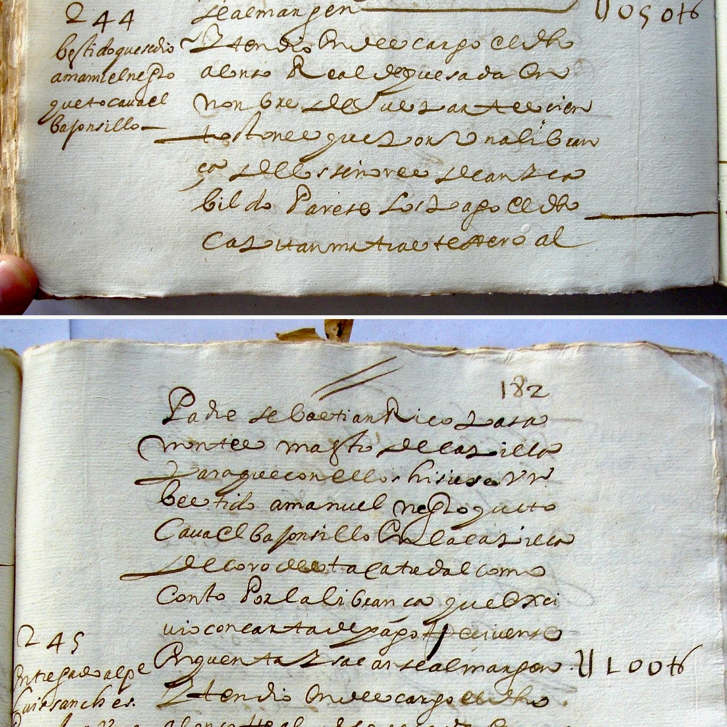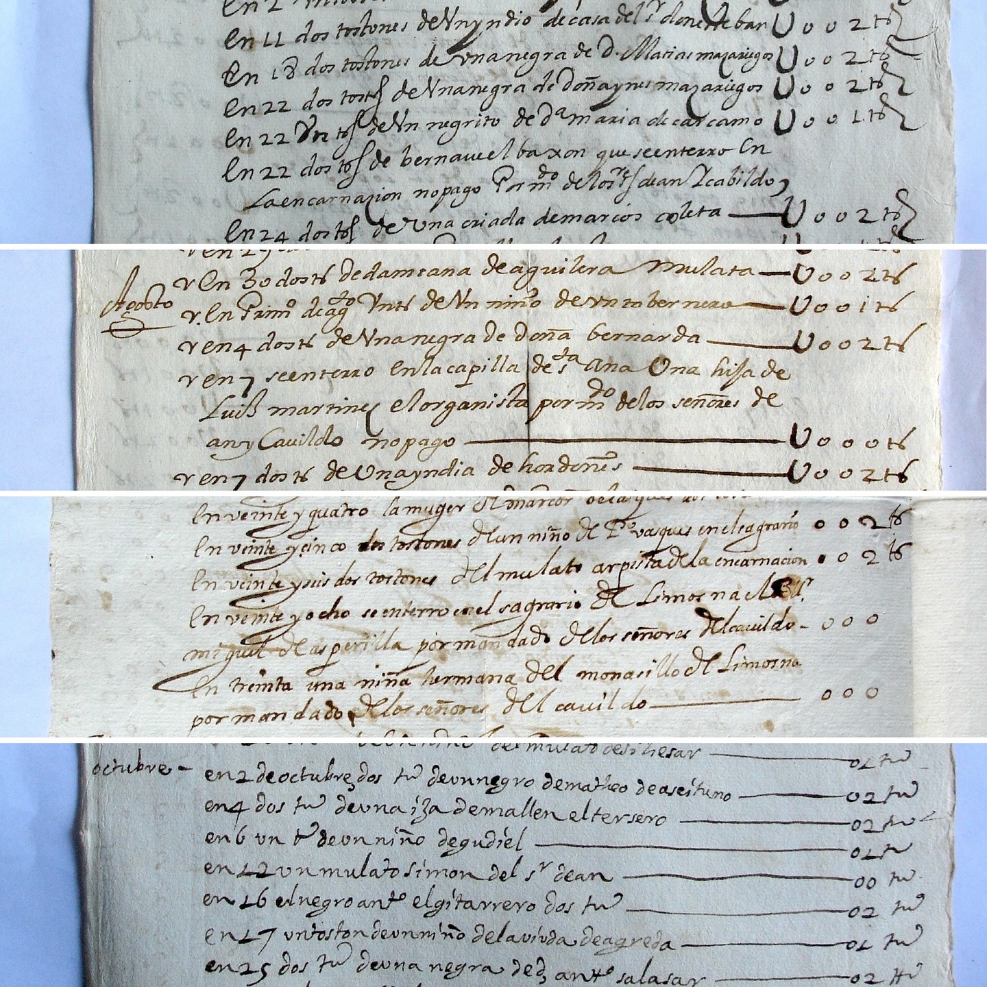| Registro en las cuentas de mayordomía de la catedral de Guatemala, correspondientes al año 1639: “Ítem, dio en descargo el dicho Alonso Real de Quesada, en nombre de sus partes, cien tostones que por una libranza de los señores deán y cabildo parece los pagó el dicho capitán Matías Tejero al padre Sebastián Rico Pasamontes, maestro de capilla, para que con ellos hiciese un vestido a Manuel, negro que tocaba el bajoncillo en la capilla de coro de esta catedral, como constó por la libranza que exhibió, con carta de pago. Recíbense en cuenta y sácanse al margen. 100 tostones”. • Brevete al margen izquierdo: “244. Vestido que se dio a Manuel, negro que tocaba el bajoncillo”. ![]() |