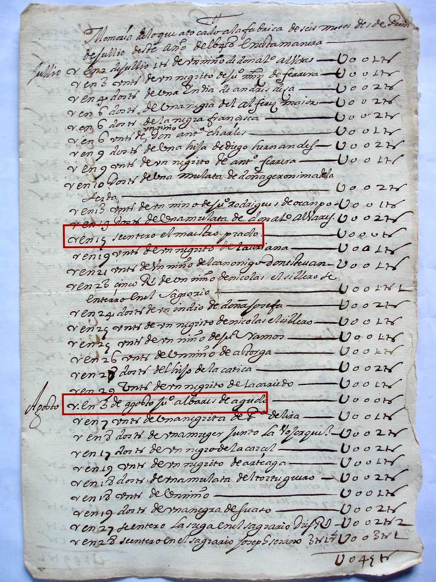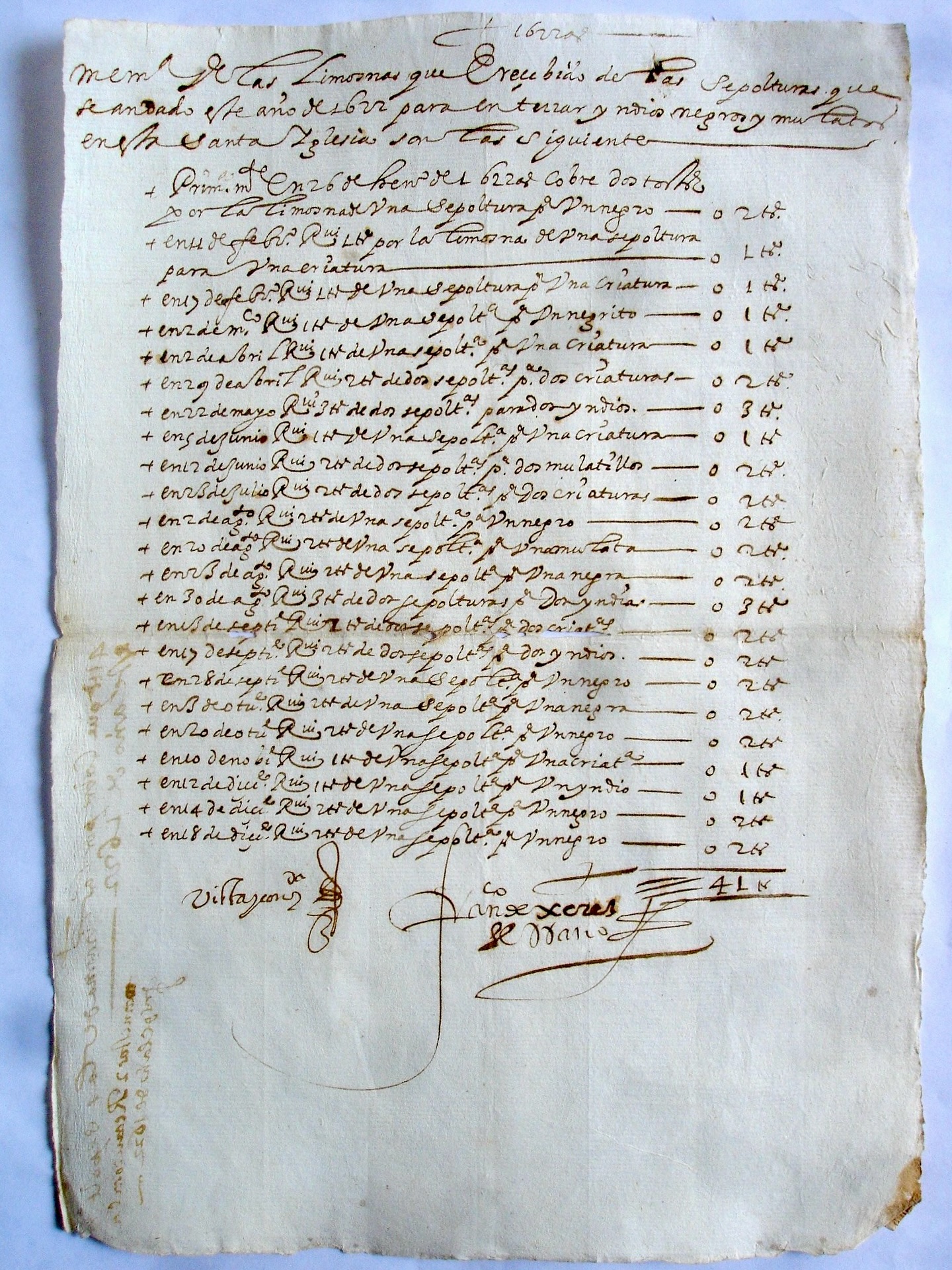 グアテマラの大聖堂の執事帳に記録されている: "アロンソ・レアル・デ・ケサダ総領事は、その一部を名指しで、10個の石を、総領事マティアス・テヘロから聖堂司祭セバスティアン・リコ・パサモンテス へ支払い、その石は、総領事マティアス・テヘロから、聖堂の廊下で棍棒を持つ黒人のマヌエルへ、支払いの手紙とともに送られた。口座で受け取り、余白で取 り出す。100トストーン」。 - 左余白に「244. バホンシージョを演奏していた黒人マヌエルに贈られたドレス」。 ![]() |