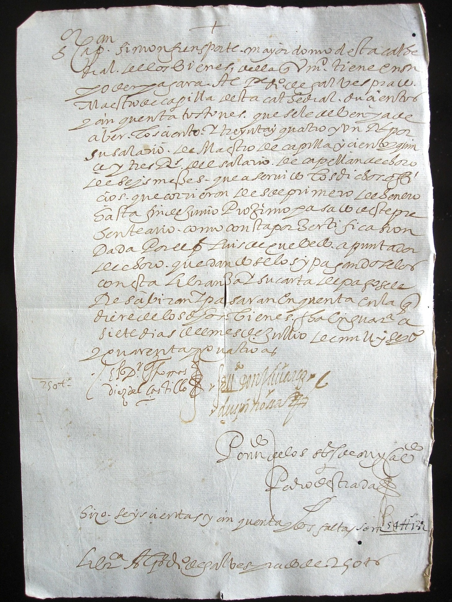 ![]() Libranza: "Señor capitán Simón Frens Porte, mayordomo de esta catedral, de los bienes de ella que vuestra merced tiene en su poder pagará al padre Diego de Gálvez Prado, maestro de capilla de esta catedral, doscientos y cincuenta tostones que se le deben y ha de haber, los ciento y treinta y cuatro y un real, por su salario de maestro de capilla, y ciento y quince y tres reales, del salario de capellán de coro, de seis meses que ha servido los dichos oficios, que corrieron desde primero de enero hasta fin de junio próximo pasado de este presente año, como consta por certificación dada por el padre Luis de Quevedo, apuntador de coro. Que, dándoselos y pagándoselos con esta libranza y su carta de pago, se le recibirán y pasarán en cuenta, en la que diere de los dichos bienes. Fecha en Guatemala, a siete días del mes de julio de mil y seicientos y cuarenta y cuatro años. El doctor Tomás Díez del Castillo [Rúbrica] El licenciado don Juan Vázquez de Espinosa [Rúbrica] Por mandado de los señores deán y cabildo, Pedro de Estrada [Rúbrica]" Anotación del apuntador de coro Luis de Quevedo: "Hizo seiscientas y cincuenta y dos faltas". Añadido: "Son 54 tostones, 13 reales". Brevete al pie: "Libranza al padre Diego de Gálvez Prado, de 250 tostones". |