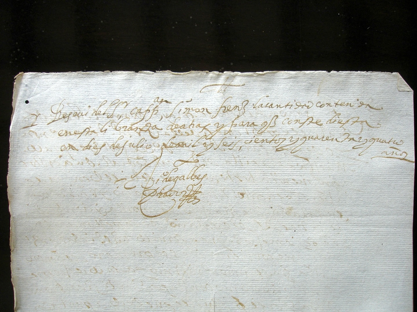 ![]() 支払書、裏面の領収書: 「私はシモン・フレンス館長から、この裏面の領収書に記載された金額を受け取った。そして、これを証明するために、1644年7月10日にこれを発行した。ディエゴ・デ・ガルベス・プラド[署名]」 |