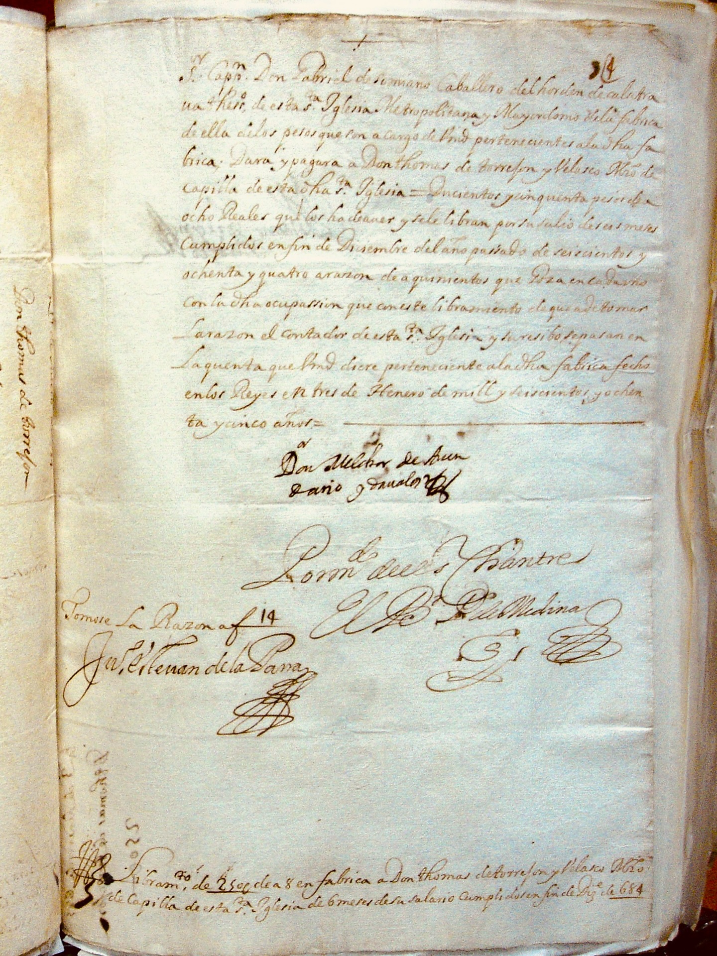 ![]() リブランサ: 「この大聖堂の執事であるシモン・フレンス・ポルテ館長よ、貴殿が管理している大聖堂の資産から、この大聖堂の礼拝堂長であるディエゴ・デ・ガルベス・プ ラド神父に、250トストンを支払わなければならない。これは、礼拝堂長としての給与として、134レアルと1レアル、 また、合唱指揮者として6か月間、すなわち本年1月1日から6月末日まで勤務した報酬として、115レアル3レアルを支払うこと。これは、合唱指揮者であ るルイス・デ・ケベド神父による証明書により確認されている。この支払通知書と支払証明書をもって、その金額を支払うことで、当該財産からその金額を受け 取り、会計処理を行う。1644年7月7日、グアテマラにて。 トマス・ディエス・デル・カスティーヨ博士 [署名] ファン・バスケス・デ・エスピノサ弁護士 [署名] ディーンおよびカビルドの命により、ペドロ・デ・エストラーダ [署名]」 聖歌隊の譜面係ルイス・デ・ケベドの注記:「652回のミスをした」。追加:「54トストン、13レアルである」。 末尾の注記:「ディエゴ・デ・ガルベス・プラド神父に250トストンを免除する」。 |