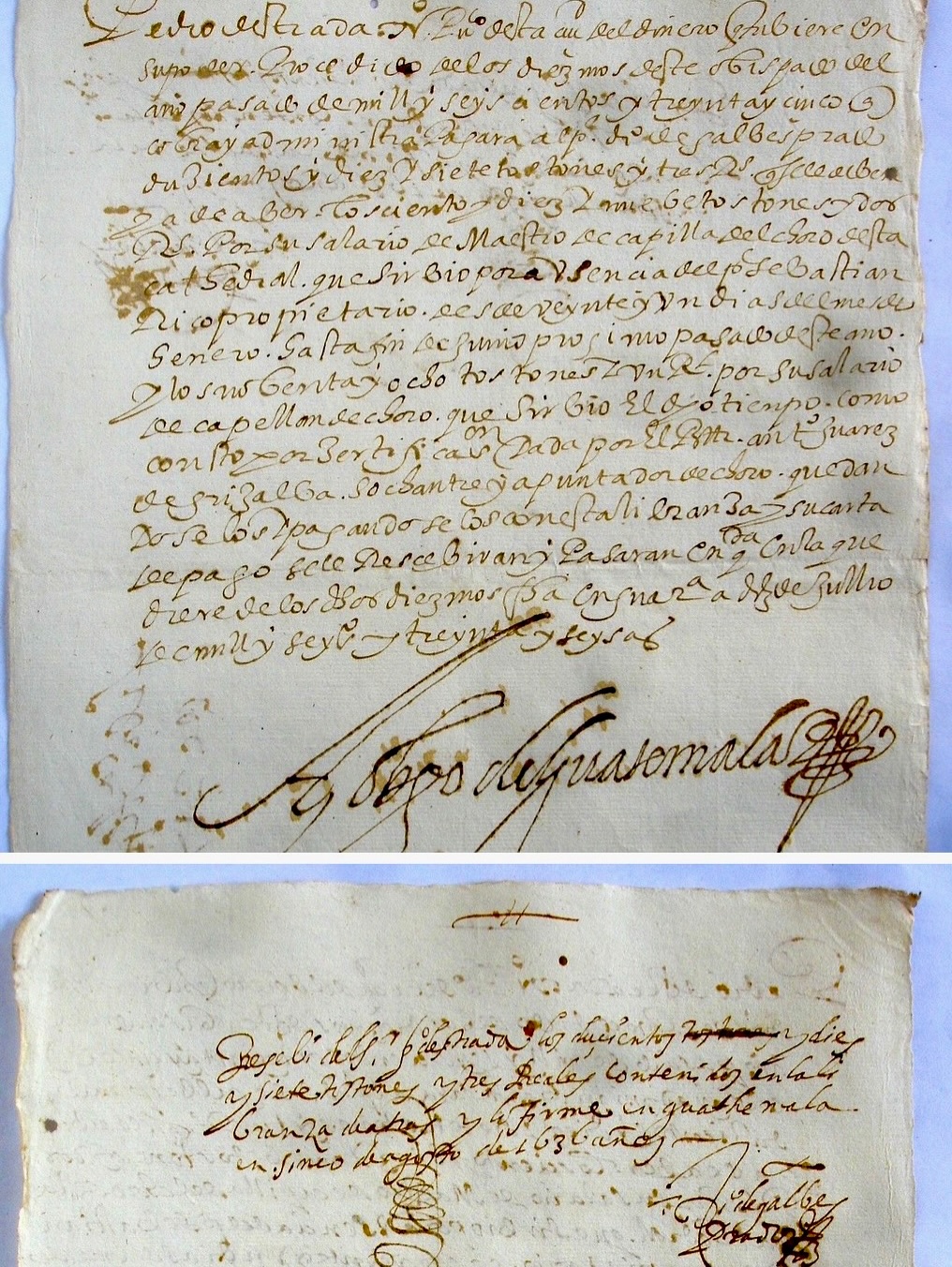 ![]() 聖歌隊の指揮者による2つの証明書。 • 1647年の証明書:「私は、グアテマラのこの聖なる大聖堂の聖歌隊の司祭であり指揮者であるルイス・デ・ケベドが、聖歌隊の師匠、聖歌隊長、聖歌隊の司 祭、 聖歌隊員、聖歌隊の少年たち、聖歌隊の指揮者、オルガニスト、時計職人、およびその他の同教会の使用人たちは、昨年1647年7月1日から同年12月末日 まで、以下の欠勤を除き、同教会に奉職したことを証明する。 - ディエゴ・デ・ガルベス・プラド神父、聖歌隊長、6か月間病気であった。 […]」 • 1648年の証明書:「私は、 ルイス・デ・ケベド、グアテマラ大聖堂聖歌隊の司祭兼譜表係は、聖歌隊長、聖歌隊長、聖歌隊司祭、聖歌隊、オルガニスト、聖歌隊の少年たち、その他の使用 人たちが、1648年7月1日から12月31日まで、以下の欠勤を除き、当該聖歌隊に奉職したことを証明する。 - 故人であるディエゴ・デ・ガルベス・プラド師は、礼拝堂長として、7月1日から同月13日(その日に亡くなった日)まで奉仕した。 - ルイス・デル・クビージョ神父 - ファン・ホセ・ゲレロは、礼拝堂長、作曲家、神学校教師であり、7月14日より、閣下、ディーン、カビルドにより礼拝堂長に任命された。 […]」 |