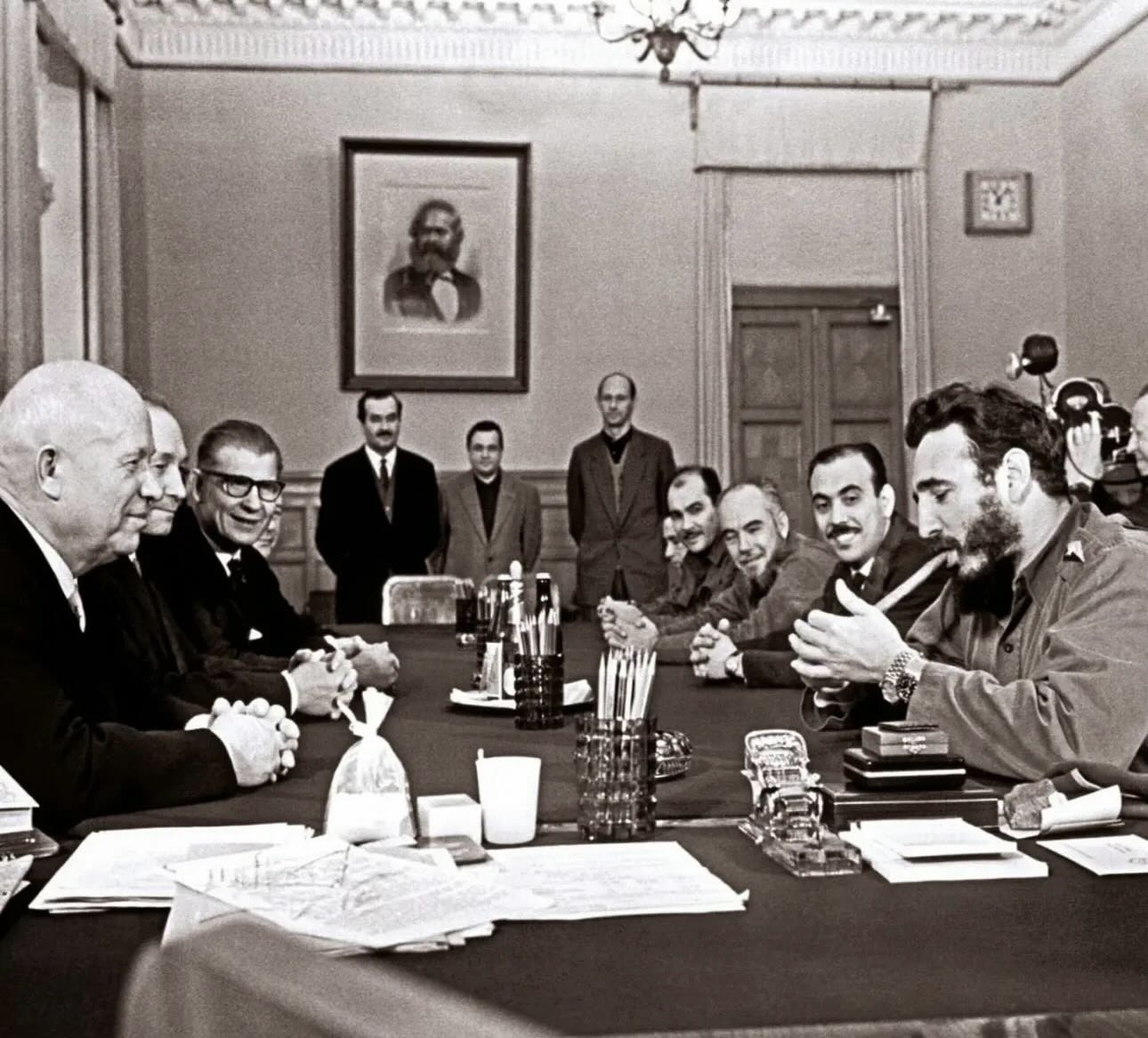 | キューバ・ミサイル・危機(Cuban Missile Crisis) キューバ危機、キューバでは10月危機(スペイン語: Crisis de Octubre)、またはカリブ危機(ロシア語: Карибский кризис、ローマ字表記: Karibskiy krizis)は、アメリカ合衆国ソビエト連邦政府の間で13日間続いた対立であり、アメリカが核ミサイルをイギリス、イタリア、トルコに配備したのに対 し、ソ連はキューバに核ミサイルを配備したことで対抗した。この危機は1962年10月16日から28日まで続いた。この対立は、冷戦が全面核戦争へとエ スカレートする寸前まで至った[1] 1959年から、米国政府はトール核ミサイルをイギリスに配備し、これはプロジェクト・エミリーとして知られた。1961年には、米国はジュピター核ミサ イルをイタリアとトルコに配置した。これら全てがモスクワの射程圏内であった。米国はキューバ亡命者からなる準軍事組織を訓練し、CIAが指揮してキュー バ侵攻と政権転覆を試みた。同年11月から、米国政府はキューバでテロリズムと破壊工作の暴力的な作戦を展開し、これはキューバ計画と呼ばれ、1960年 代前半を通じて継続した。ソ連政府は、キューバがソ連との関係が中国に傾くことを懸念していた。ソ連と中国の関係は次第に険悪になっていた。こうした要因 を受けて、1962年7月にニキータ・フルシチョフとフィデル・カストロの両首脳が会談し、将来の米国による侵攻を阻止するため、キューバに核ミサイルを 配備することで合意した。その後まもなく、発射施設の建設が開始された。 10月、U-2偵察機が中・長距離発射施設の写真証拠を撮影した。米国大統領ジョン・F・ケネディは、国家安全保障会議およびその他の主要顧問による会合 を招集し、国家安全保障会議執行委員会(EXCOMM)を結成した。ケネディは、ソ連のミサイル供給を妨害するためにキューバ領土への空爆を実施し、その 後キューバ本土への侵攻を行うよう助言を受けた。彼は宣戦布告を避けるため、より穏健な方針を選択した。10月22日、ケネディはさらなるミサイルの キューバ到達を阻止するため、海軍による海上封鎖を命じた。[2] 彼は封鎖を「検疫」と呼び、封鎖とは呼ばなかった。これにより米国は戦争状態の正式な意味合いを回避できたのである。[3] ケネディとフルシチョフの間で最終的に合意が成立した。ソ連はキューバに配備した攻撃兵器を、国連の検証を条件に撤去する代わりに、米国はキューバへの再 侵攻を行わないことを公に宣言し、合意する。米国はトルコに配備した攻撃兵器の全廃を密かに承諾した。英国に配備された全トールミサイルは1963年8月 までに撤去された。ソ連がミサイルを撤去する一方、一部のソ連爆撃機はキューバに残留し、米国は1962年11月20日まで海上封鎖を維持した。[3] [4] キューバから全ての攻撃用ミサイルと爆撃機が撤去された後、11月20日に封鎖は正式に終了した。両大国間の迅速かつ直接的な連絡手段の必要性が明らかに なった結果、モスクワ・ワシントンホットラインが設置された。その後の一連の合意により、数年間にわたり米ソ間の緊張は緩和された。 この妥協案はフルシチョフとソ連を当惑させた。なぜならイタリアとトルコからの米軍ミサイル撤去はケネディとフルシチョフの秘密協定であり、ソ連は自ら招 いた状況から後退していると見なされたからである。2年後のフルシチョフの失脚は、米国への最終的な譲歩と危機を招いた無能さの両方に対するソ連政治局の 恥辱が一部原因であった。駐米ソ連大使であるアナトリー・ドブリニンによれば、ソ連最高指導部はキューバ問題の結末を「屈辱に近い威信への打撃」と受け止 めた。[5][6] https://en.wikipedia.org/wiki/Cuban_Missile_Crisis ![]() ゲームツリーは、米国とソビエト連邦が自らの決定をどのように検討したかをモデル化する ![]() クレムリンを訪問したキューバ革命政府(1963年) References 1. Scott, Len; Hughes, R. Gerald (2015). The Cuban Missile Crisis: A Critical Reappraisal. Taylor & Francis. p. 17. ISBN 978-1-317-55541-4. Archived from the original on 29 July 2016. Retrieved 31 December 2015. 2. Society, National Geographic (21 April 2021). "Kennedy 'Quarantines' Cuba". National Geographic Society. Retrieved 11 May 2022. 3. Colman, Jonathan (1 May 2019). "Toward 'World Support' and 'The Ultimate Judgment of History': The U.S. Legal Case for the Blockade of Cuba during the Missile Crisis, October–November 1962". Journal of Cold War Studies. 21 (2): 150–173. doi:10.1162/jcws_a_00879. ISSN 1520-3972. 4. "Milestones: 1961–1968 – The Cuban Missile Crisis, October 1962". Office of the Historian. Archived from the original on 3 April 2019. 5 William Taubman, Khrushchev: The Man and His Era (2004) p. 579. 6. Jeffery D. Shields (7 March 2016). "The Malin Notes: Glimpses Inside the Kremlin during the Cuban Missile Crisis" (PDF). Woodrow Wilson International Center for Scholars. |