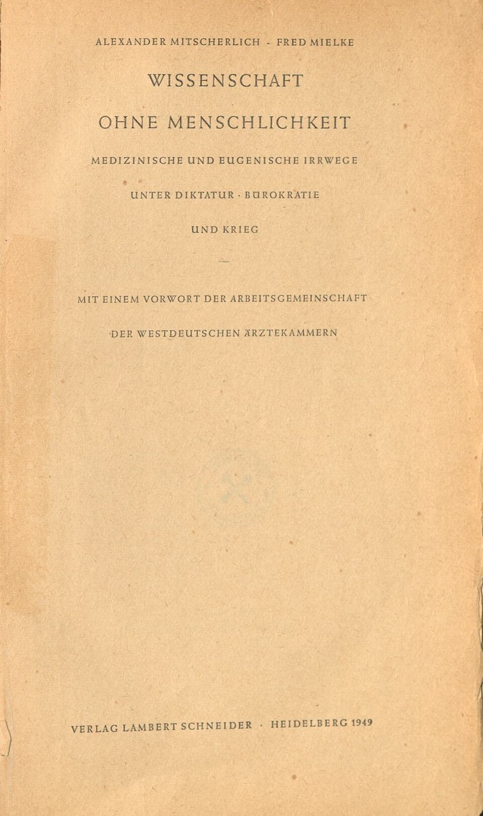 ナチス医師裁判の監視、1946年~1947年 第二次世界大戦の終結後、1946年に西側3地域の医師会から、ニュルンベルクで行われた「ナチス医師裁判」を監視する委員会の委員長に任命された。彼は 「医師団に対する集団的罪悪感という概念を、マスコミや世論から払拭するためにあらゆる手段を講じる」という任務を課せられた。この委員会には、ミッ チャーリヒの他に、アリス・フォン・プラテン=ハラームントや彼の同僚であるフレッド・ミールケ(1922-1959)など、さらに5人が参加していた。 1947年3月、裁判の記録『人間軽視の独裁:ニュルンベルク医師裁判とその情報源』が25,000部発行された。ミッチェルリッヒは、この本の中で、強 制収容所におけるドイツ人医師たちの犯罪について報告した。当初、DMW(ドイツ医学週刊誌)に報告を掲載する計画があったが、編集部がこれを拒否したた め、この計画は頓挫した。編集部は、パンフレット『人間軽視の独裁:ニュルンベルク医師裁判とその情報源』や他の医学雑誌についても言及しなかった。他の 報道機関では、このパンフレットについてほとんど言及されなかった。[3] 1949 年、委員会は、ナチス医師裁判に関する最終報告書「人間性を欠いた科学:独裁、官僚主義、戦争の下での医学と優生学の誤った道」を 10,000 部発行した。1960 年、ミッチャーリヒは次のように回想している。「[…] この本は、ほとんどどこにも知られていなかった […] それは謎のままであり、まるでこの本が出版されなかったかのようだった」と回想している。この本の運命は、今日でも不明のままである。ミッチェルリッヒ は、医師会によって「全部買い取られた」のではないかと推測している。なぜなら、すべての部数が「出版後まもなく書店から」消えたからだ」[4]。 それ以来、アレクサンダー・ミッチャーリヒはドイツの医学部から締め出され、[…] 医学部に招かれることはなかった。彼が招かれたのは、フランクフルト大学の哲学学部だった。1960年、1949年の裁判の記録が『人間性を欠いた医療』 というタイトルで再出版された。[5][6][7] この本は1996年までに119,000部が印刷され、世間の大きな反響を呼んだ。この本の中で、ミッチャーリヒは、約90,000人の現役医師によって 犯されたとされる350件の医療犯罪についても意見を述べている。この数字は、ミッチャーリヒの同僚であるフレッド・ミールケが1948年にシュトゥット ガルトで開催された医師会議で提起したもので、それ以来、残りの医師たちの無実を証明するために流布していた。ミッチャーリヒは、この事実について「特に 犯罪の規模を考えると、これは依然としてかなりの数字だ […]。しかし、それは本質ではない。350人は直接的な犯罪者だった――しかし、彼らを(無関係な者たち)に変える機会を与えた機構が存在したのだ」 [8] この衝撃を哲学的に処理するために、彼は20年の歳月を費やし、1967年に妻マルガレーテとともに『悲嘆の無力』を出版した。 |