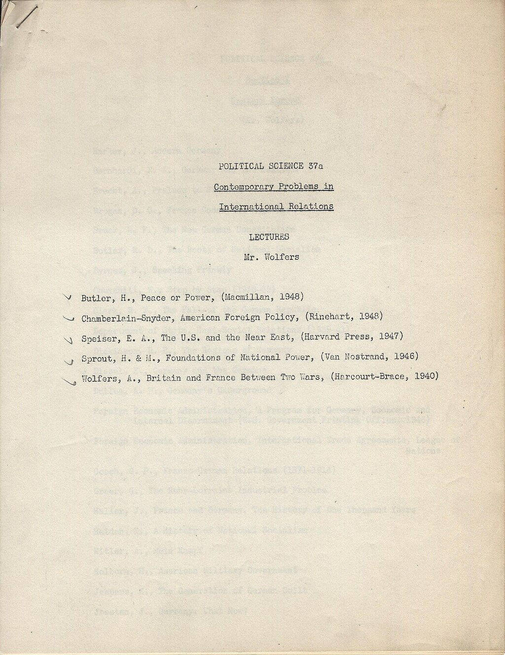 第二次世界大戦への関与 ヴォルファーズは第二次世界大戦中、米国の戦争遂行に積極的に協力した。[50] 1942年から1944年にかけて、バージニア州シャーロッツビルにある軍事統治学校で特別顧問兼講師を務め、将来の占領軍となる訓練課程受講者に対し、 ドイツの社会と政府に関する知識を伝えた。[2][54] [55] 同期に、1942年から1944年まで陸軍憲兵総監部(Office of Provost Marshal General)の専門顧問を務めた。[2] また1944年と1945年には戦略情報局(Office of Strategic Services, OSS)の顧問も担当した。[2] イェール大学の教授陣は、諜報機関に適した学生を募集する窓口として機能した。歴史家ロビン・ウィンクスによれば、ウォルファーズほど積極的に活動した者 はいなかった。彼はイェール国際研究所を通じてワシントンでの人脈を巧みに活用したのである。[56] 全体として、ピアソン・カレッジ出身者が諜報機関職員に占める割合は異常に高かった。ウォルファーズに加え、ウォレス・ノットスタインやC・ブラッド フォード・ウェルズといったピアソン・フェローたちも募集活動に関与した。[49] ピアソン・カレッジの居住者で後に諜報機関の要職に就いた人物には、ジェームズ・ジーザス・アングルトンがいる。彼はよくウォルファーズの居間に訪れ、 ウォルファーズが招いたロバート・フロストなどの詩人の朗読を聴いていた。[57] これらの朗読会には、後に米国桂冠詩人となるリード・ウィットモアも参加していた。[57] ウォルファーズは若きアングルトンを気に入り、その後も交流を続けた。[57] ウォルファーズのもう一人の後援対象はロバート・I・ブルームで、彼はOSSのX-2対諜報部門の初期中核メンバーの一人となり、ウルトラ暗号の解析にお ける英国との連絡役を担った。[58] ウォルファーズは、通信や暗号を含むアメリカ外交通信の研究に携わっていた。[51] そのため、彼は戦前に諜報問題に専門的な関心を持つ数少ない専門の人民の一人となった。[58] さらに、ドリス・フォーラーの姉であるアニタ・フォーラーはOSSの工作員となり、アレン・ダレスの指示でスイスにおいて秘密かつ危険な作戦を遂行した。 [9] それ以前には、詩人ライナー・マリア・リルケの文通相手でもあった。[59] 1944年6月、ウォルファーズは「公正かつ永続的な平和のための委員会」が組織した10名の著名なプロテスタント聖職者・信徒グループの一員として、戦 後のドイツへの対応方針を提唱する署名声明を発表した。声明は「貧困化したドイツは世界の平和に対する脅威であり続ける」として、ドイツを経済的に困窮状 態に置いたり過大な賠償を課したりすべきでないと主張。また、ユダヤ人絶滅作戦や占領地における戦争犯罪に対する処罰は責任者に限定し、命令を実行しただ けの者には拡大すべきでないと述べた。[60] ヨーロッパ戦勝記念日から一ヶ月後、ヴォルファースは書簡を発表した。その中で彼はナチス強制収容所の「衝撃的な暴露」に言及しつつも、ドイツの人民の将 来を導くには「厳格だが人道的な規則」を推奨したのである。[5] |