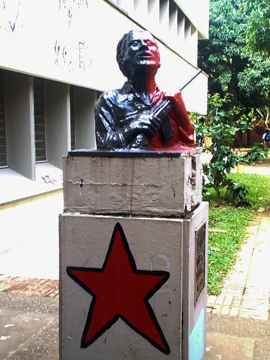 ![]() コロンビア国立大学にあるカミロ・トーレスへの敬意を表した壁画?(銅像)。 カトリック系ゲリラ ゲリラ活動中、トーレスはハイメ・アレナスに指導と助言を受けた。アレナスはファビオ・バスケスによって選ばれた人物であり、トーレスを進歩的な潮流から 遠ざける役割も担っていた。ELN加入直前、ANAPO指導者グスタボ・ロハス・ピニージャ将軍は、司祭であるトーレスに軍隊と対峙する武器の扱いの経験 がないとして、いかなるゲリラ組織にも加入しないよう勧告した。彼は貧困層への奉仕活動を称賛しつつ、政治活動への継続を提案したが、トーレスはこの助言 を脅威と受け止め無視した。エルンにアルヘミロの戦時名で加入した際、外国人と思われたトーレスの正体はゲリラ内では一時不明だったが、後に正体が明らか になった。 『フレンテ・ウニド』創刊号に掲載された「キリスト教徒へのメッセージ」で述べたように、彼は「大多数の幸福のための効果的な手段は... は少数派によって追求されることはない」と「権力を持つ特権的少数派によって追求されることはない。なぜなら、こうした効果的な手段は概して少数派に特権 の犠牲を強いるからだ」と結論づけた。トーレスは「したがって、特権的少数派から権力を奪い、貧しい多数派に与える必要がある」と主張し、「革命は、すべ ての人への愛を実現する唯一の効果的かつ広範な道と見るキリスト教徒にとって、許されるだけでなく義務である」と述べた。[29] カミロ・トーレスはこうして、1965年に教師兼司祭の職を辞しゲリラ、具体的には国民解放軍(ELN)に加わる決断を正当化した。彼は農民出身ゆえに当 初はコロンビア革命軍(FARC)への参加に関心を持っていたものの。[30] 私は聖職者の特権と義務を捨てたが、司祭であることをやめたわけではない。隣人愛から革命に身を捧げたと信じている。この隣人愛を、世俗的・経済的・社会 的な領域で実現するために、ミサを捧げることを止めたのだ。隣人が私に恨みを抱かなくなり、革命を達成した時、神が許せば再びミサを捧げるつもりだ。この 道こそがキリストの教えに従うことだと信じる。「もし祭壇に供え物を捧げようとして、そこで兄弟があなたに対して何か恨みを持っていることを思い出したな ら、供え物を祭壇の前に置いたまま、まず兄弟と和解しなさい。それから戻って供え物を捧げなさい」(聖マタイによる福音書5章23-24節)。 —カミロ・トーレス「キリスト教徒へのメッセージ」『フレンテ・ウニド』第1号、1965年8月26日、ボゴタ。[29] ELNでは、トーレスは主に下級メンバーとして参加し、カトリックの観点から精神的・イデオロギー的な支援を提供した。しかし、過酷な訓練(同志の補助を 受けながら)や小銃の携行に慣れていなかったため、ゲリラとしての能力は低く、ほとんど拳銃しか与えられず、精神的・イデオロギー的な支援の役割と優れた 料理人としての能力が重視された。トーレスはゲリラの医師としても活動し、身体的・精神的両面で治療を行った。[31] 彼は農村の子どもたちに福音書を教え、毛沢東、ウラジーミル・レーニン、フィデル・カストロの著作を翻訳した。また「森の教会」を組織し、十字架の横にカストロの肖像画を掲げた。[31] 死の前にはELNの指導者となった。[32] 彼はまた「組織の主要なイデオロギー家」として台頭した[33]。彼の影響下で、ELNはカトリックを明示的に受け入れマルクス・レーニン主義を融合させただけでなく、初期カトリック教会の構造に倣って組織再編を行った。 トーレス神父は、民間人時代に様々な学生運動組織を通じて既にELN指導部と接触していた経緯から、同組織の主要なイデオロギー家の一人となった。トーレ ス神父は武装組織に、マルクス・レーニン主義とキリスト教の教えを融合させたさらなるイデオロギー的・実践的基盤を注入した。これは今日に至るまで組織の 行動様式と活動手法に影響を与えている。[...] ELNは間もなく、トップダウン型の統制構造ではなく、集団意思決定プロセスを備えた多頭制組織という、一種の連合体へと変貌した。この構造の背景には、 紀元1~3世紀の初期カトリック教会の体制を模倣する意図があった。すなわち「教会会議」形式で戦略的課題を議論しつつ、地方教会に自治権を認める仕組み である[34]。 彼は初の実戦経験で命を落とした。ELNが国家軍パトロール隊を待ち伏せ攻撃した際のことだ。国家軍は特にトーレスを狙っており、彼は死亡時に残酷に殴打 された[35]。また至近距離で射殺されたことも明らかになった[36]。別の死亡報告では、倒れたゲリラ同志の武器を拾おうとした際に射殺されたとされ る[12]。死後、カミロ・トーレスはELNの公式殉教者となった。 |
